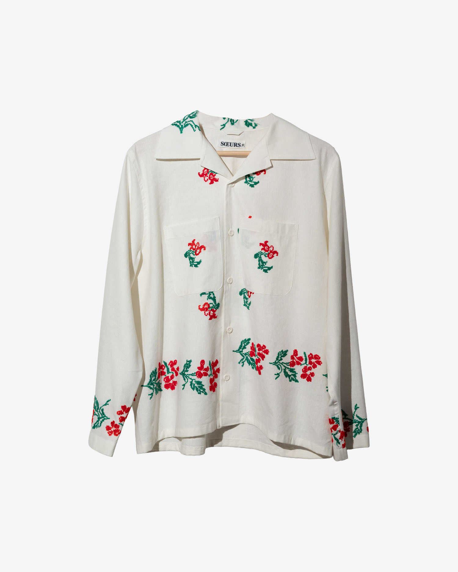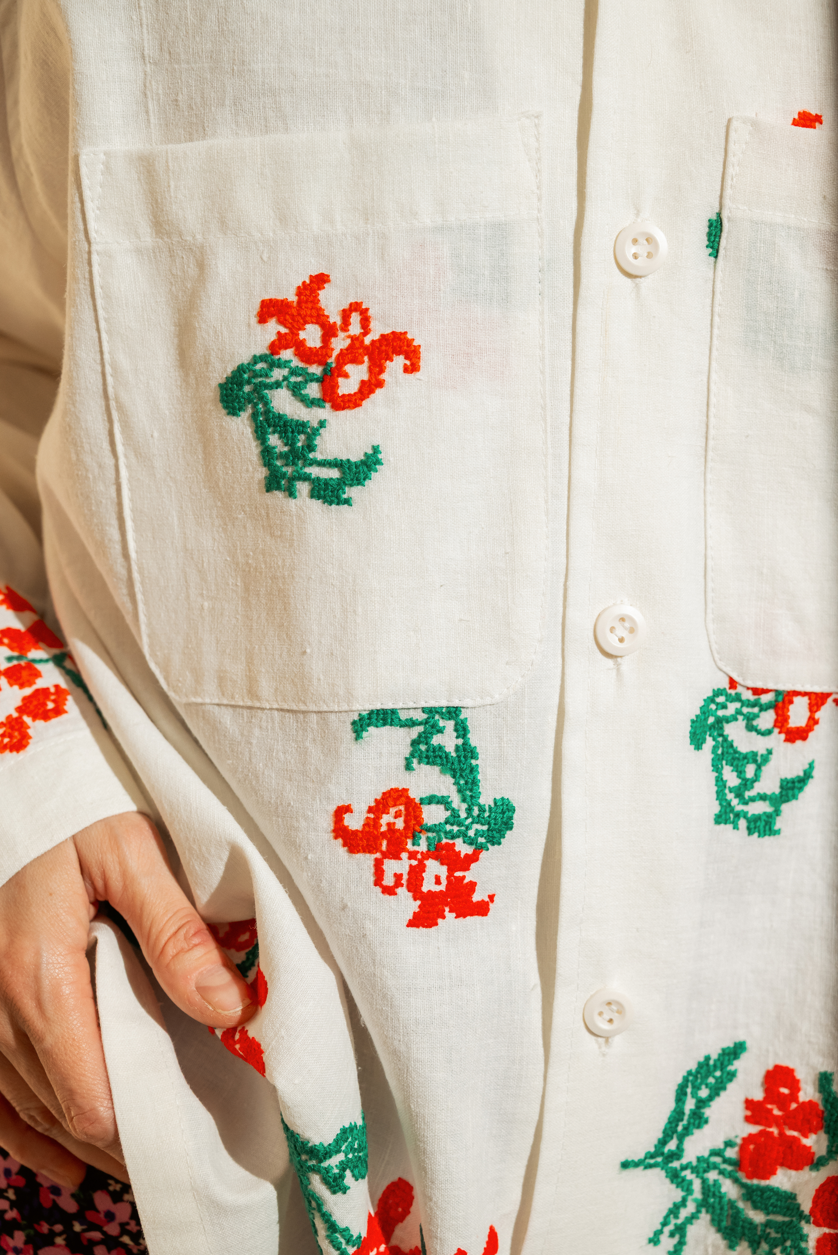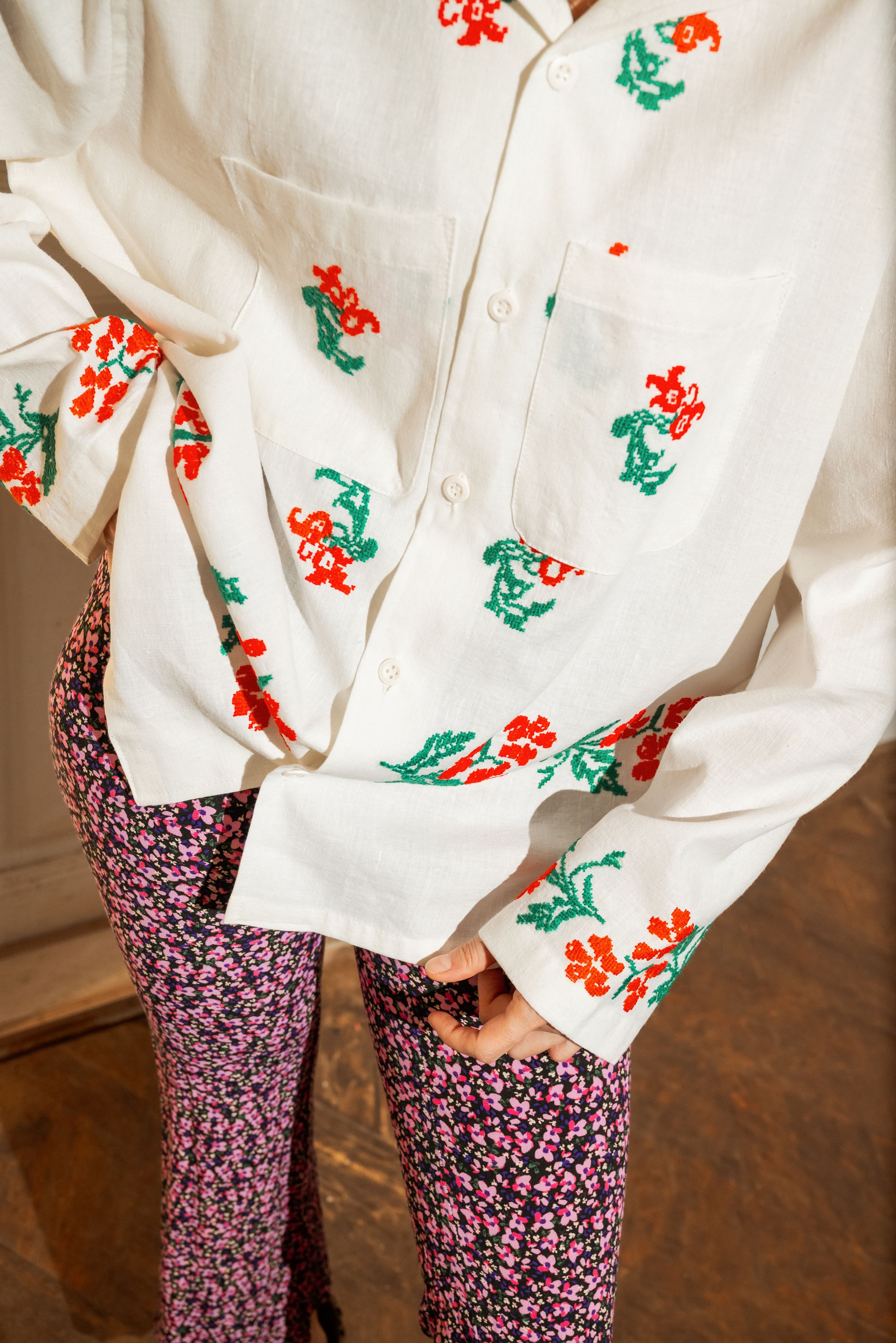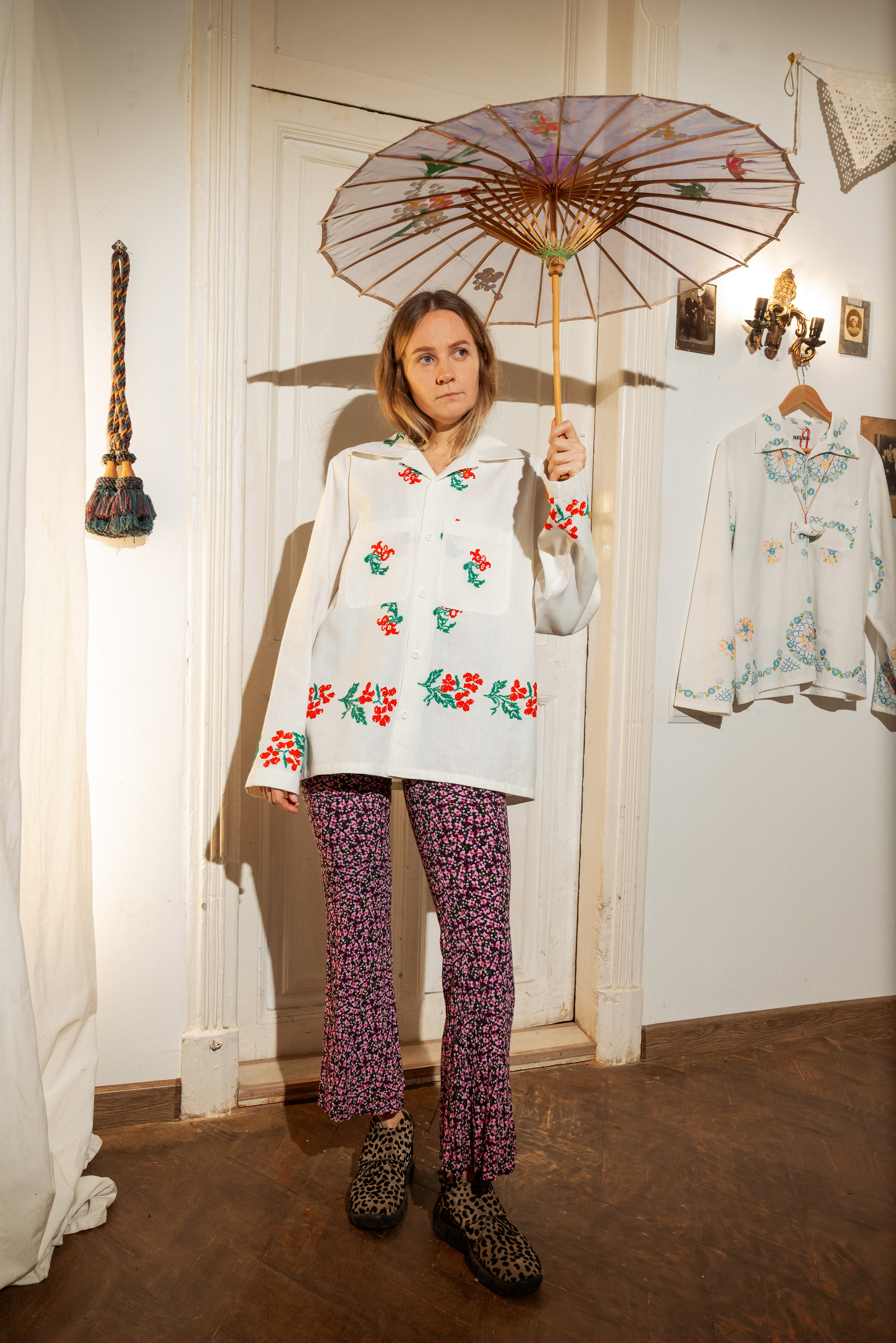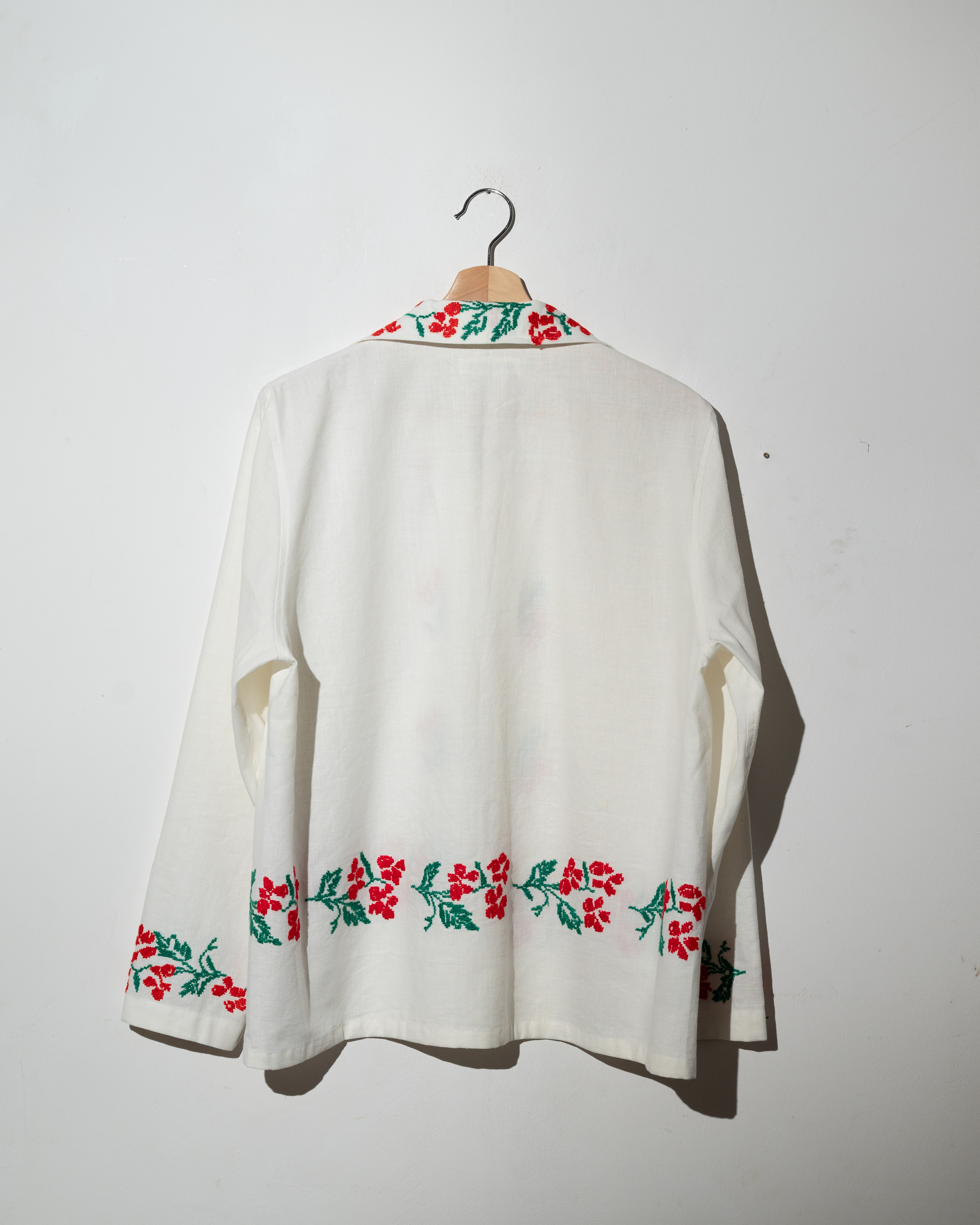 Рубашка с длинными рукавами сшита в одном экземпляре из антикварной хлопковой скатерти (хлопок 100%), периода 1960х годов. Скатерть была украшена вышитыми повторяющимися цветами.