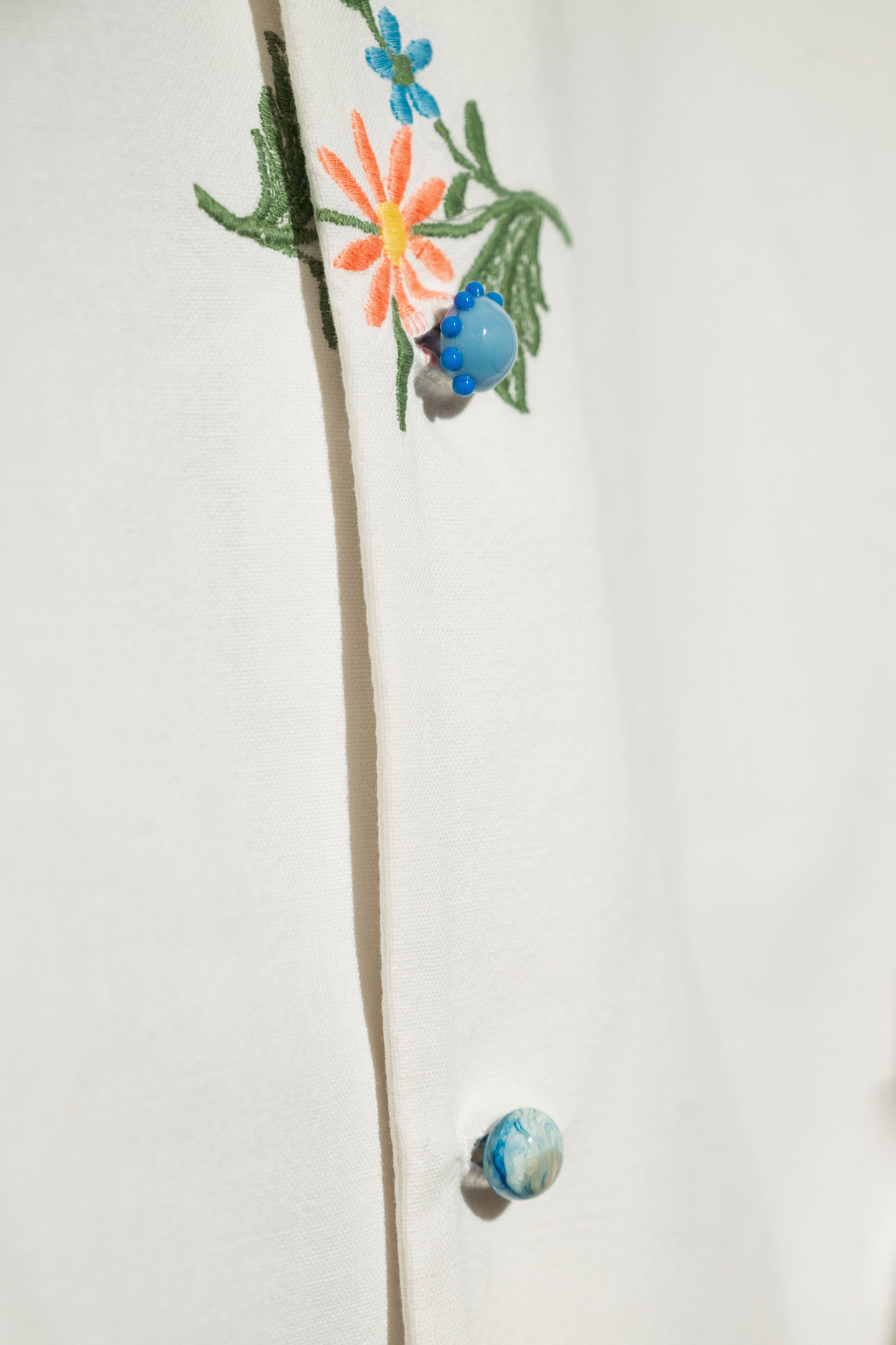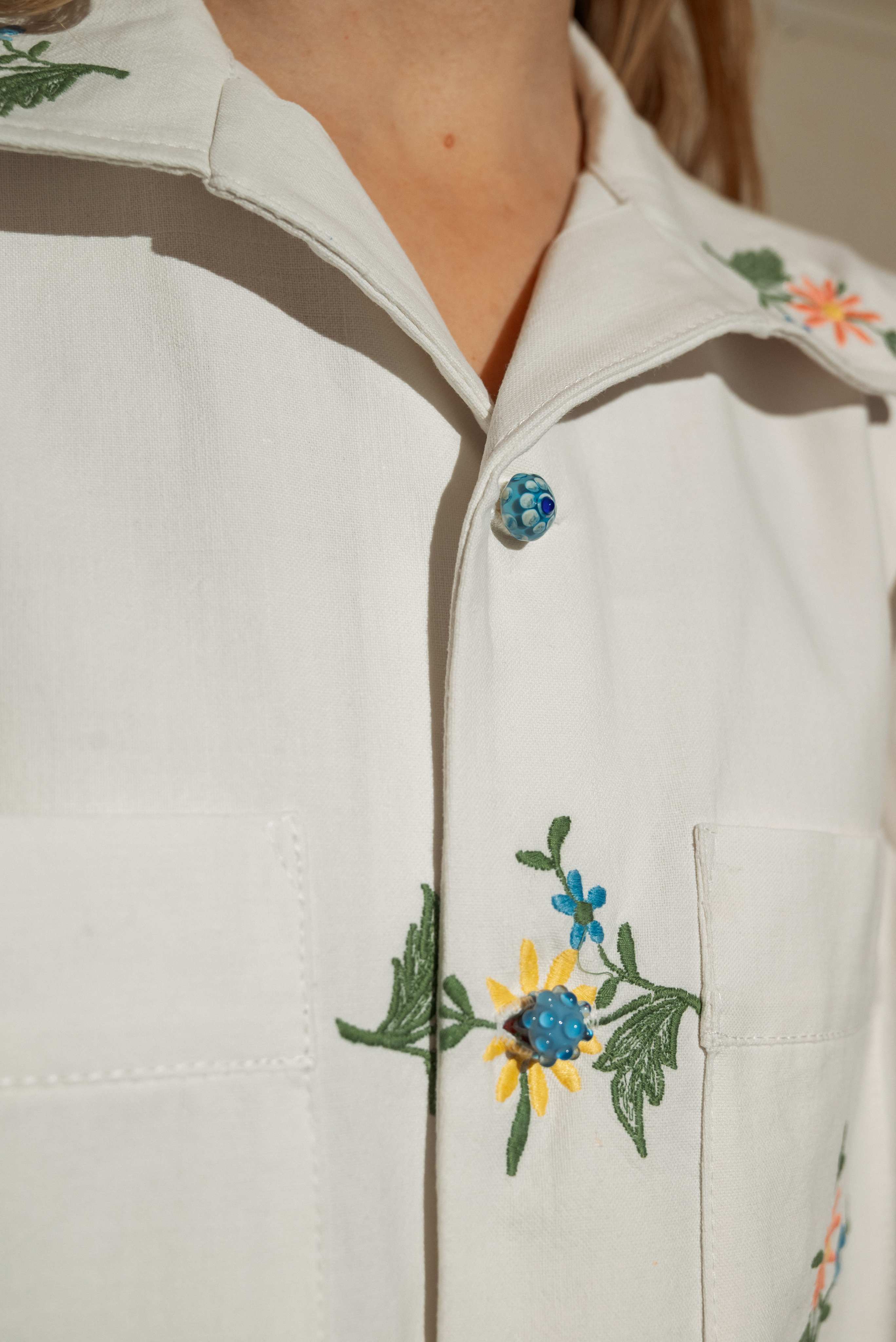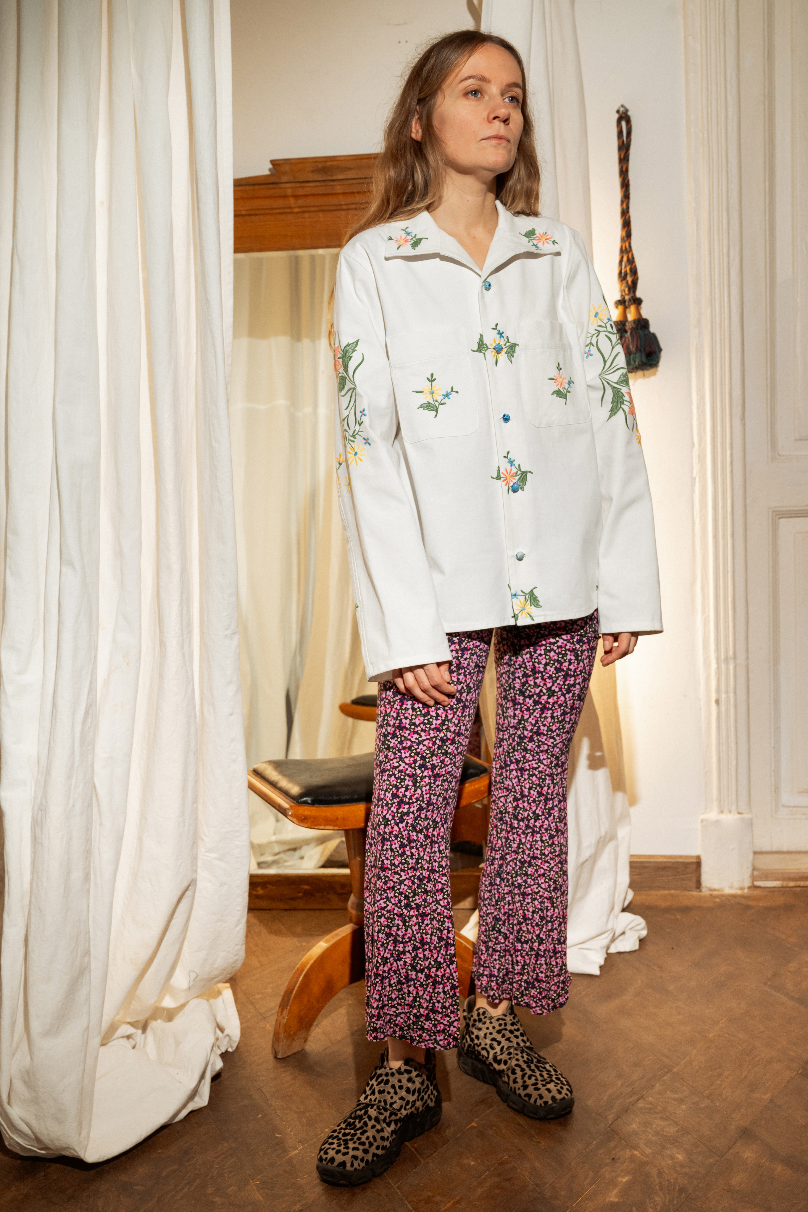 Рубашка с длинными рукавами сшита в одном экземпляре из антикварной хлопковой скатерти (хлопок 100%), периода 1970х годов. Скатерть была украшена вышитыми цветами.