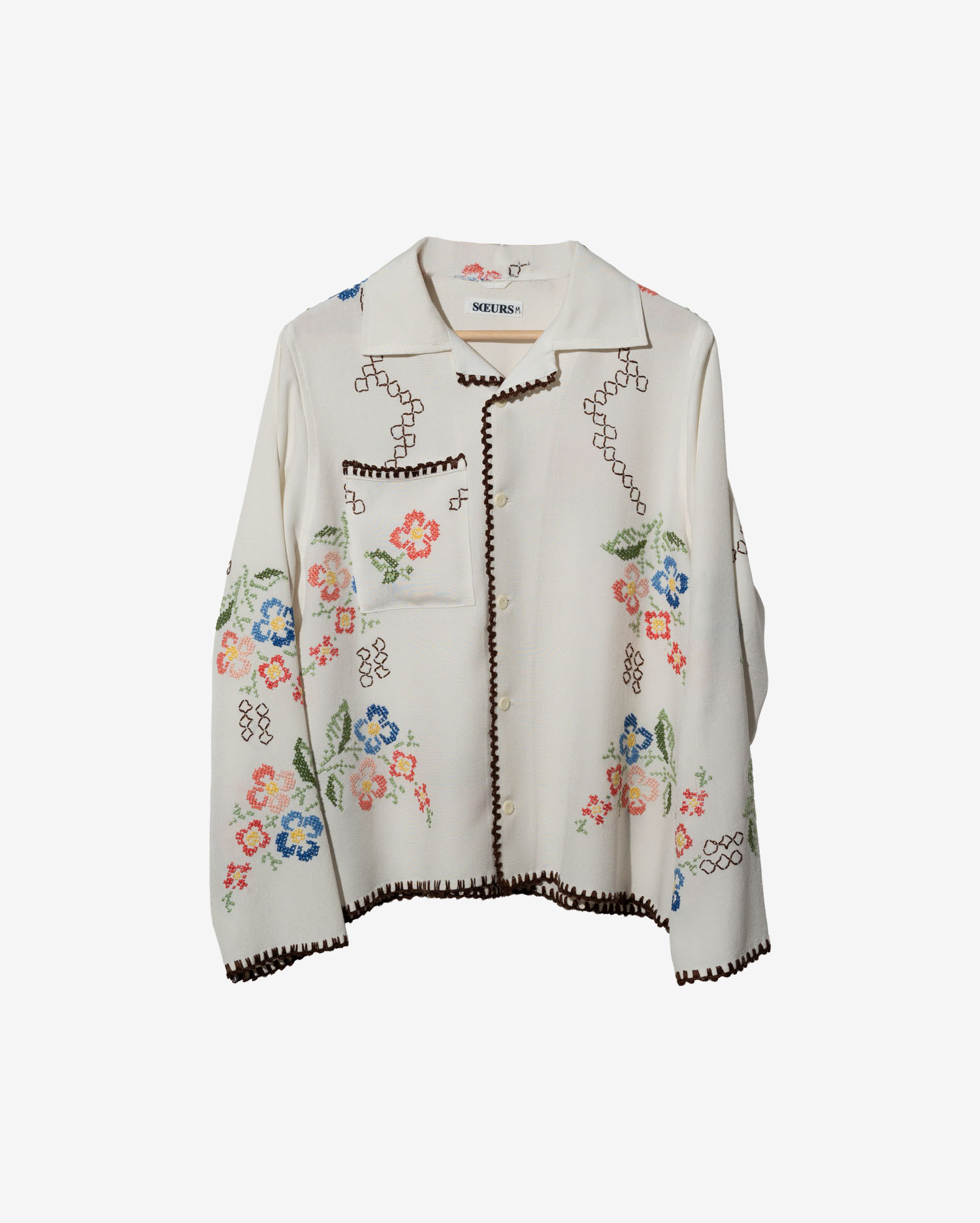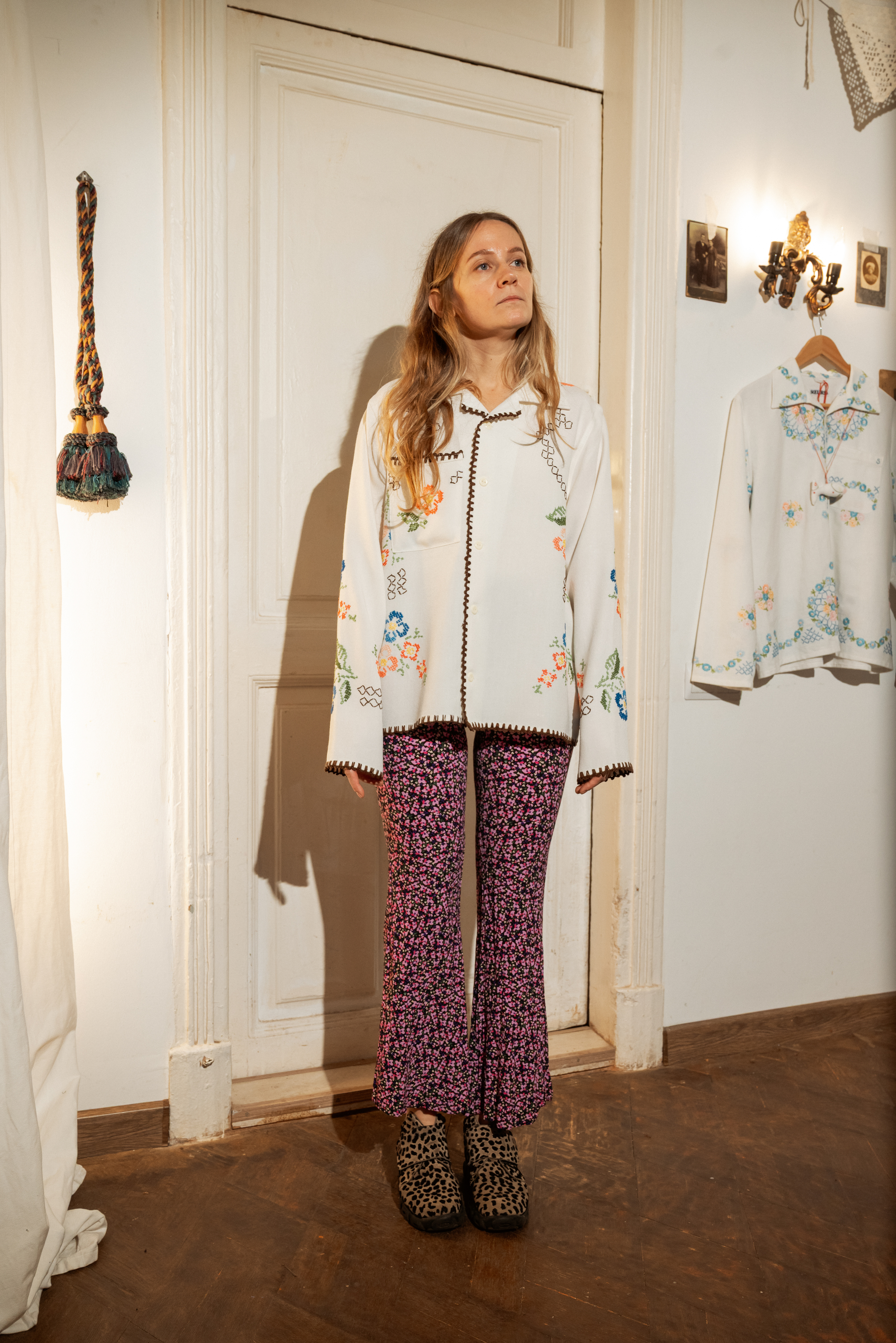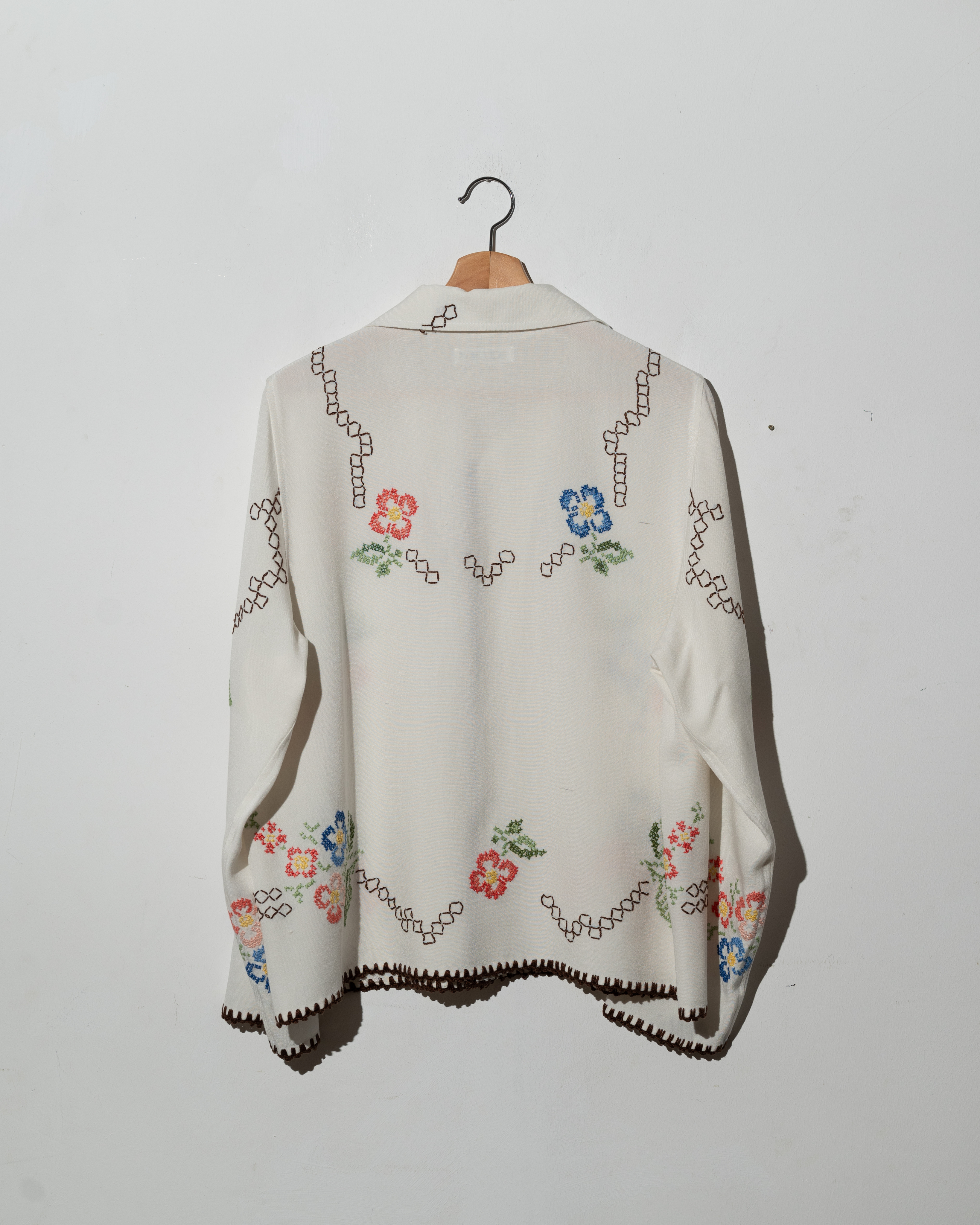 Рубашка с длинными рукавами сшита в одном экземпляре из антикварной скатерти (полиэстер 50%, хлопок 50%), не датирована. Скатерть украшена крупной вышивкой крестиком и вышивкой по краю.