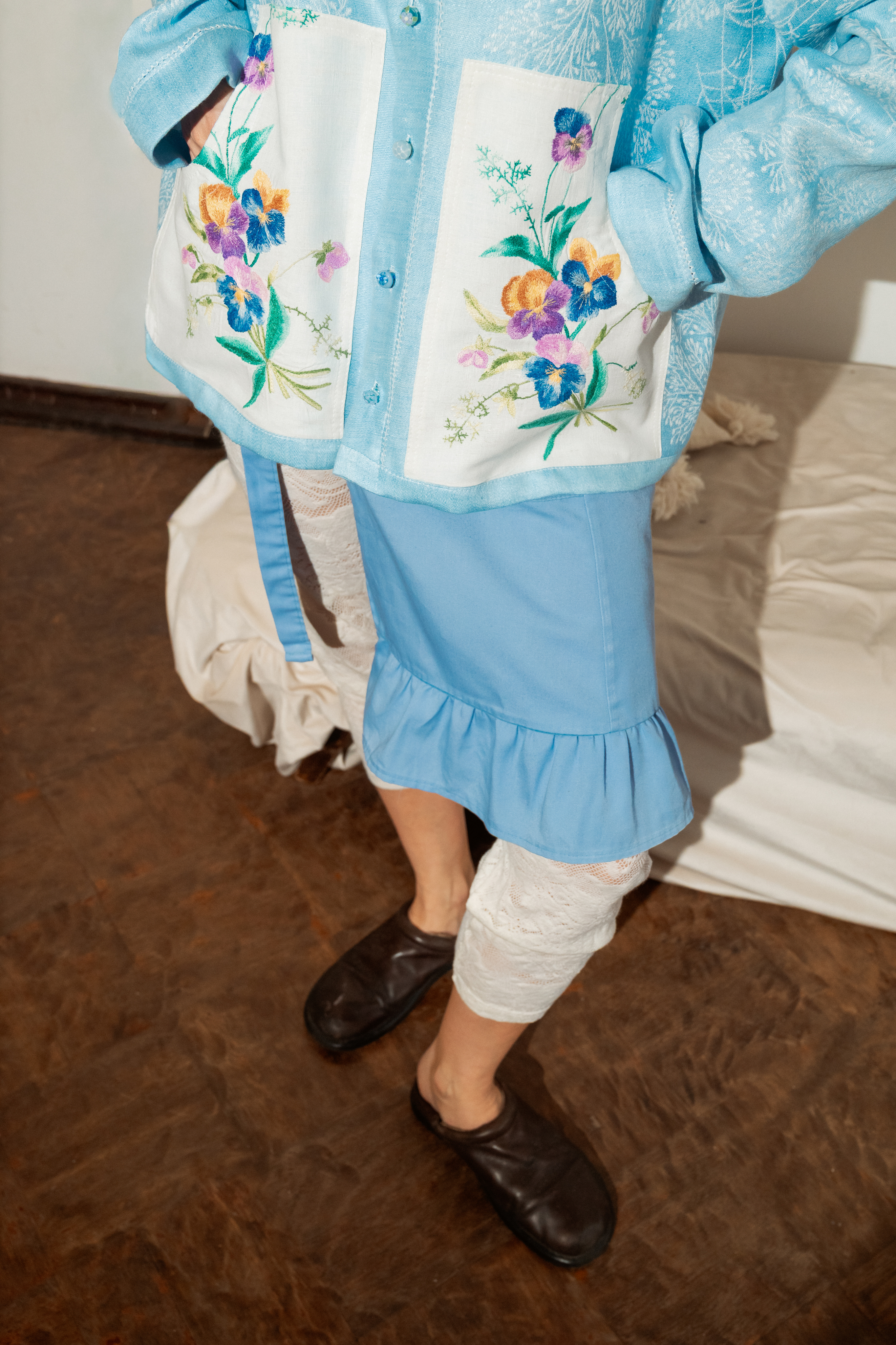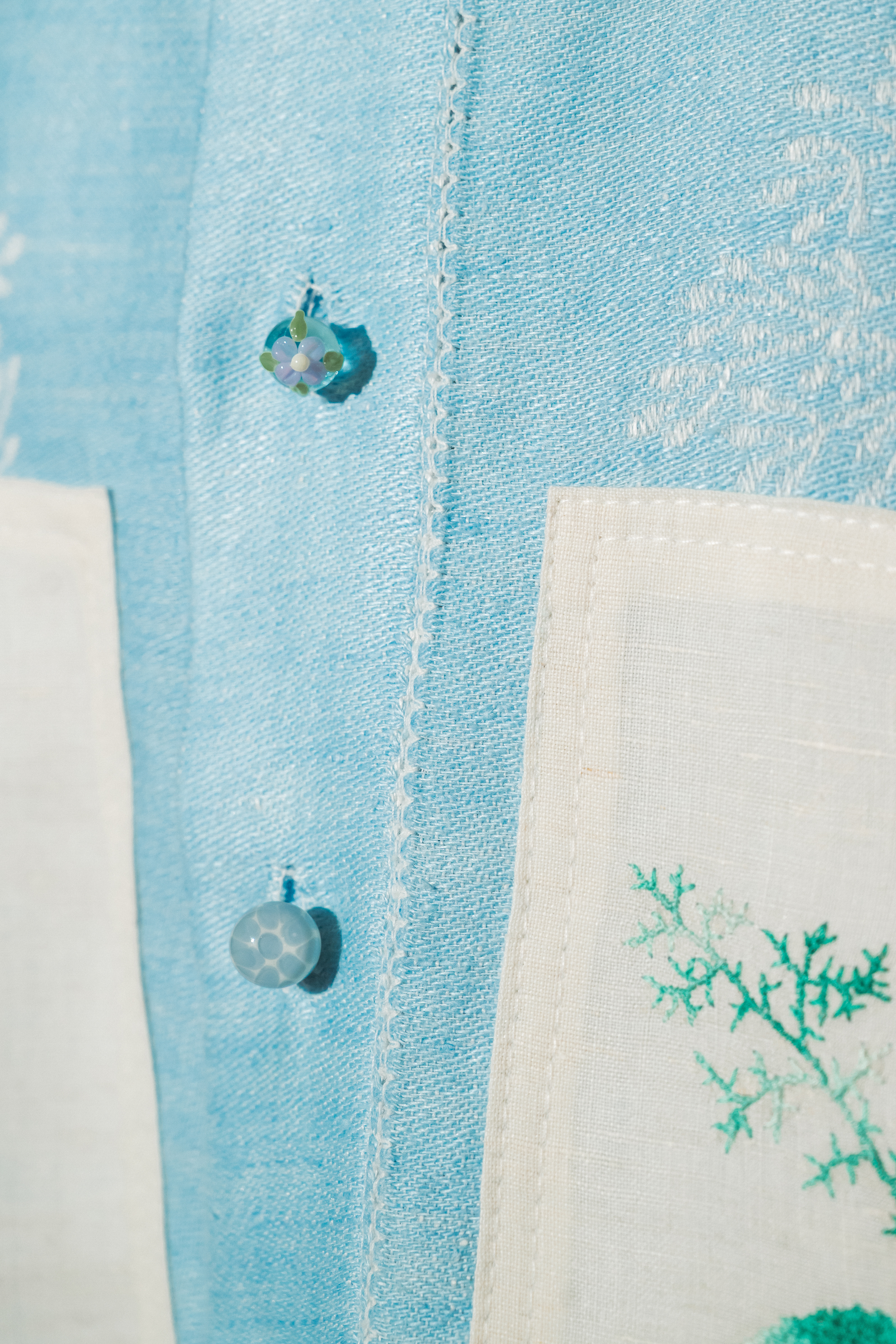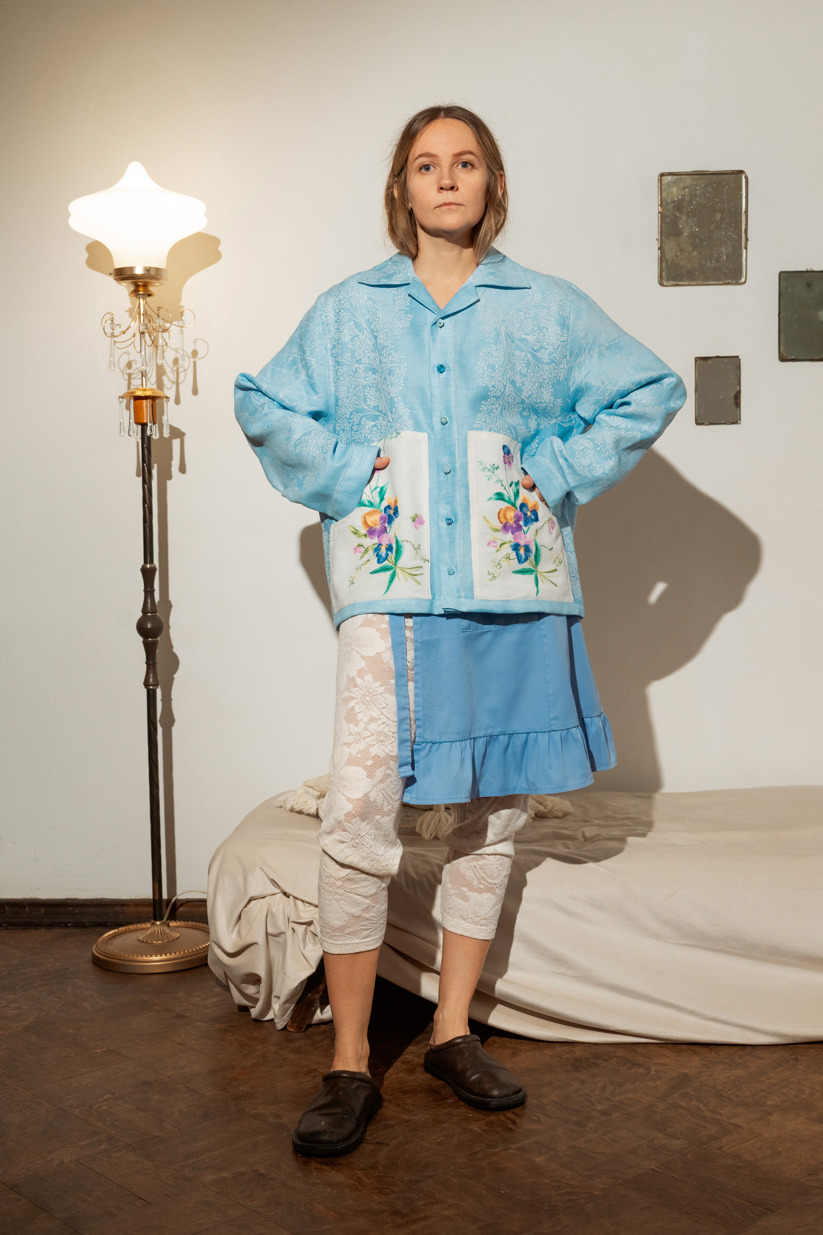 Рубашка с длинными рукавами сшита в одном экземпляре из антикварной хлопковой скатерти (хлопок 100%), не датирована. Скатерть украшена растительным узором. Карманы выполнены из хлопковой салфетки с вручную выполненной вышивкой цветов.