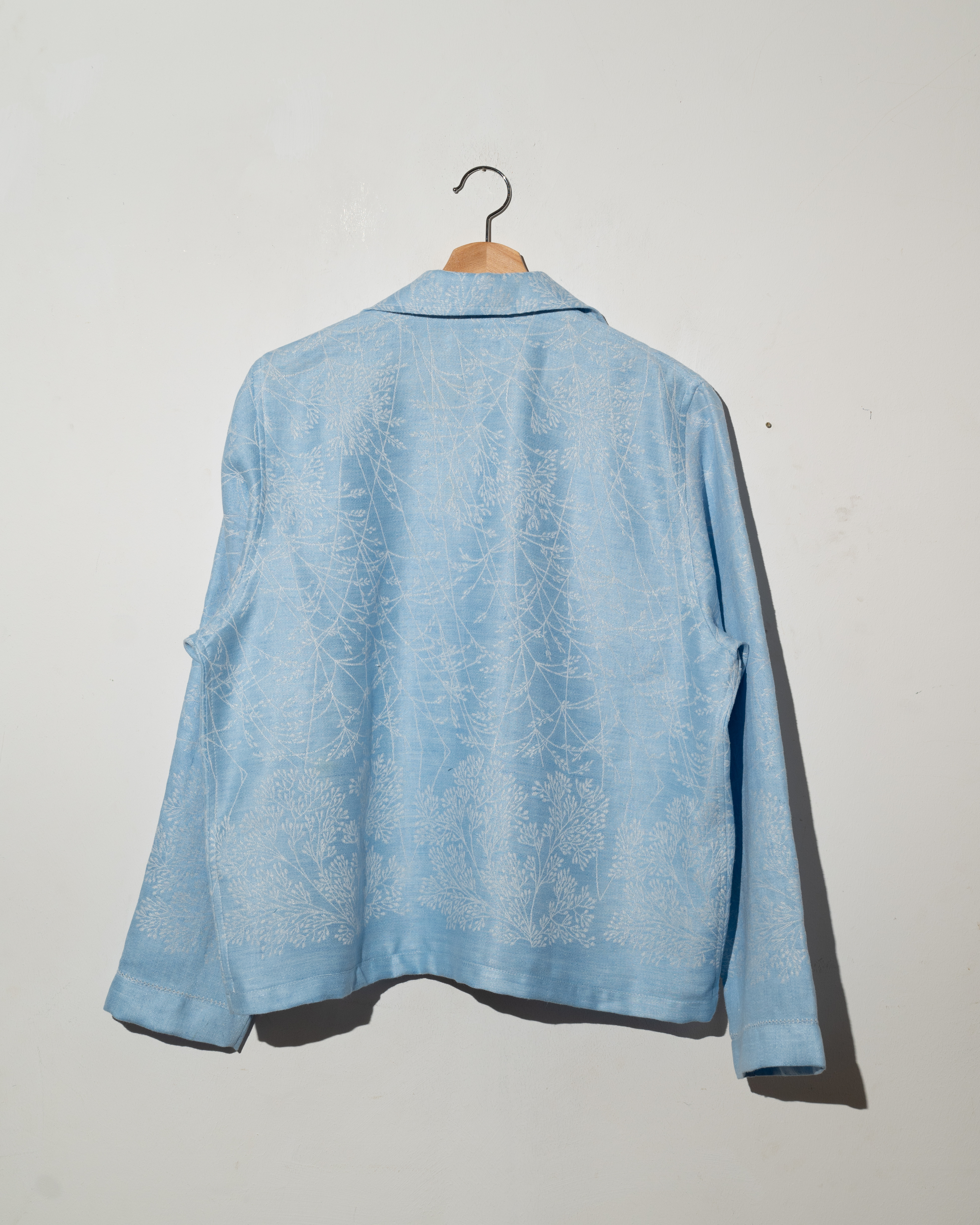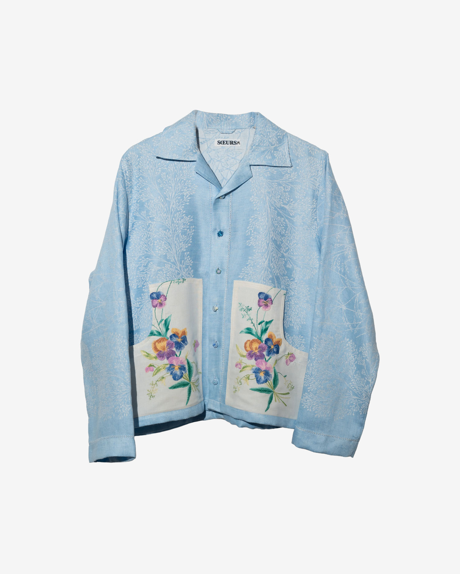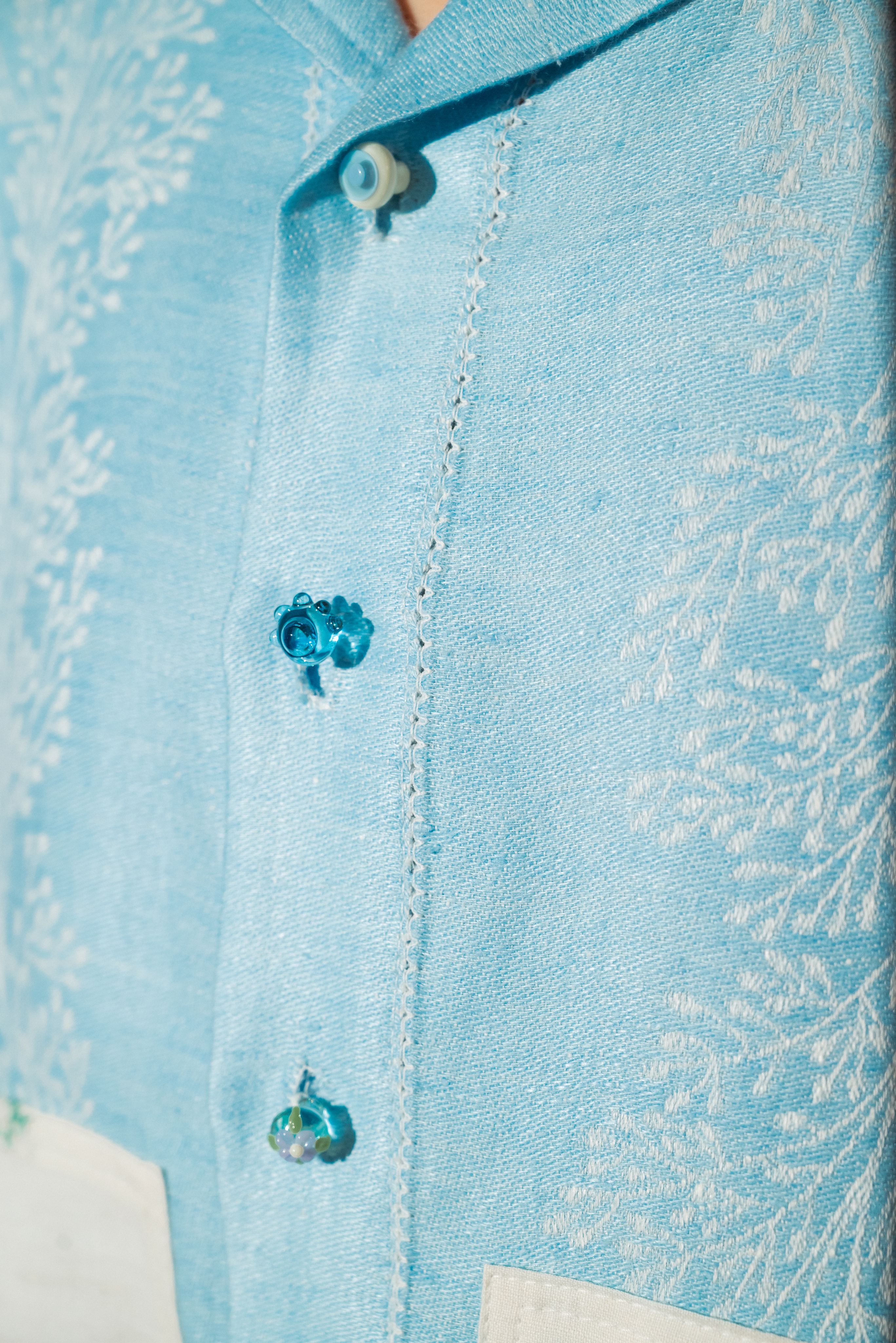 Рубашка с длинными рукавами сшита в одном экземпляре из антикварной хлопковой скатерти (хлопок 100%), не датирована. Скатерть украшена растительным узором. Карманы выполнены из хлопковой салфетки с вручную выполненной вышивкой цветов.
