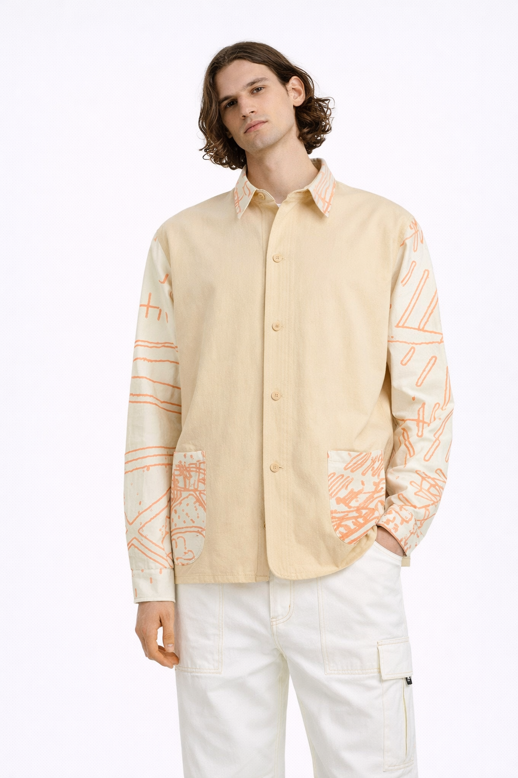 Рубашка свободного кроя, прямого силуэта с длинным рукавом. Воротник рубашечный на стойке. Спереди два вместительных накладных кармана. Застежка по переду и на манжетах рукава на пуговицы.