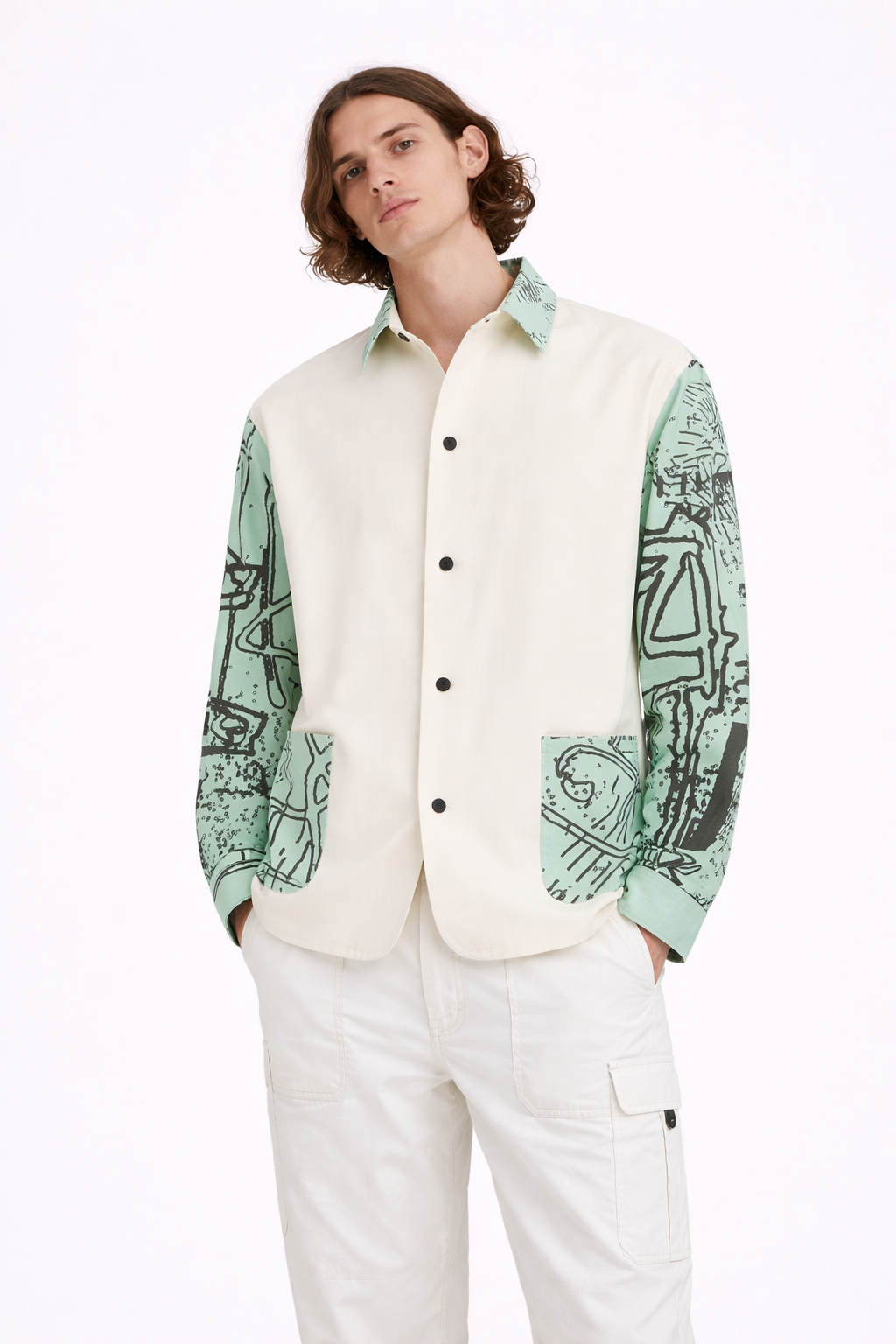 Рубашка свободного кроя, прямого силуэта с длинным рукавом. Воротник рубашечный на стойке. Спереди два вместительных накладных кармана. Застежка по переду и на манжетах рукава на пуговицы.