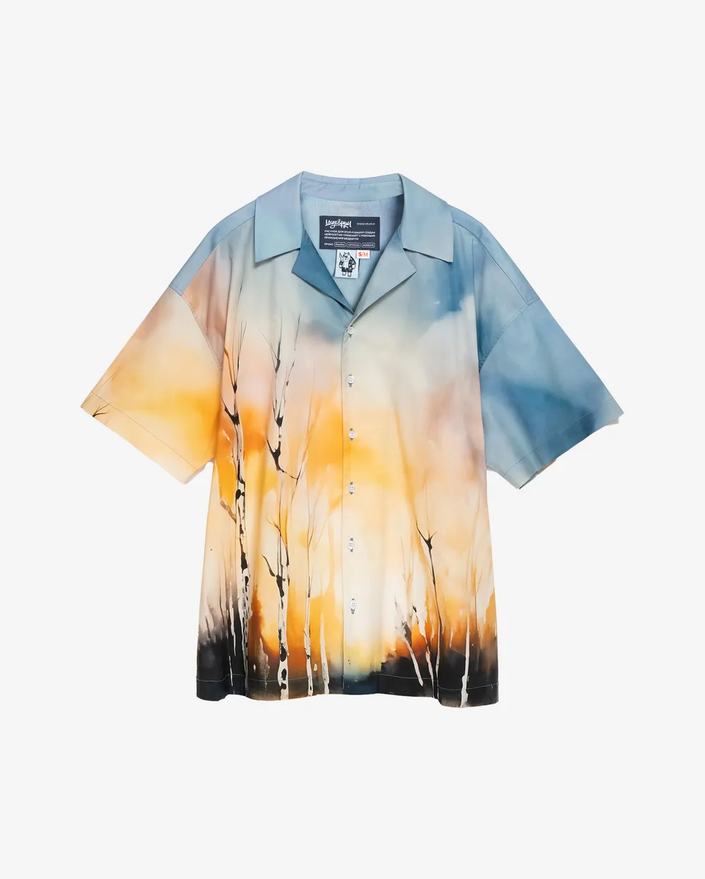 Хлопковая гавайская рубашка с принтом нейроберёз. Рисунок создан по макету Шедеврума — приложения, работающего на основе нейросети YandexART. Свободная, цветная и лёгкая, специально для солнечных дней.