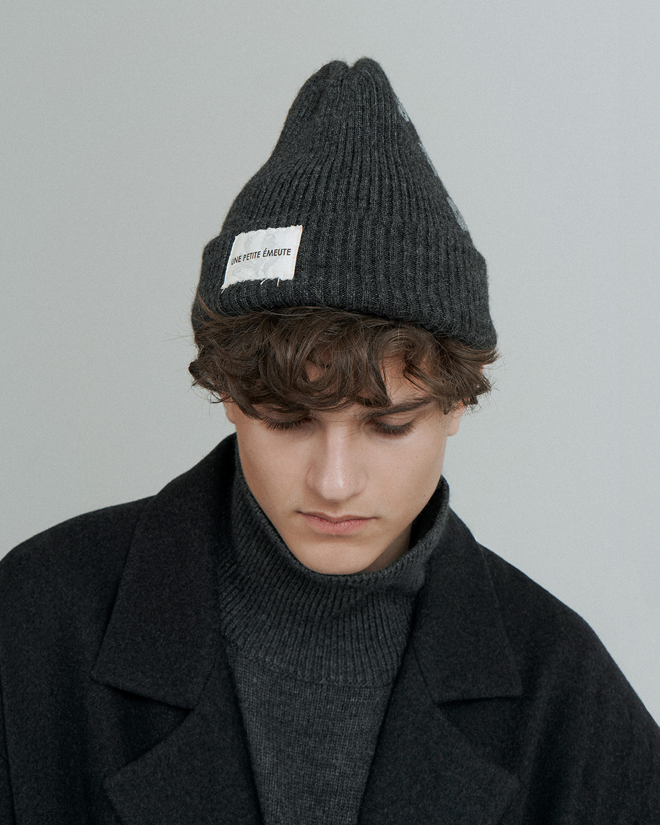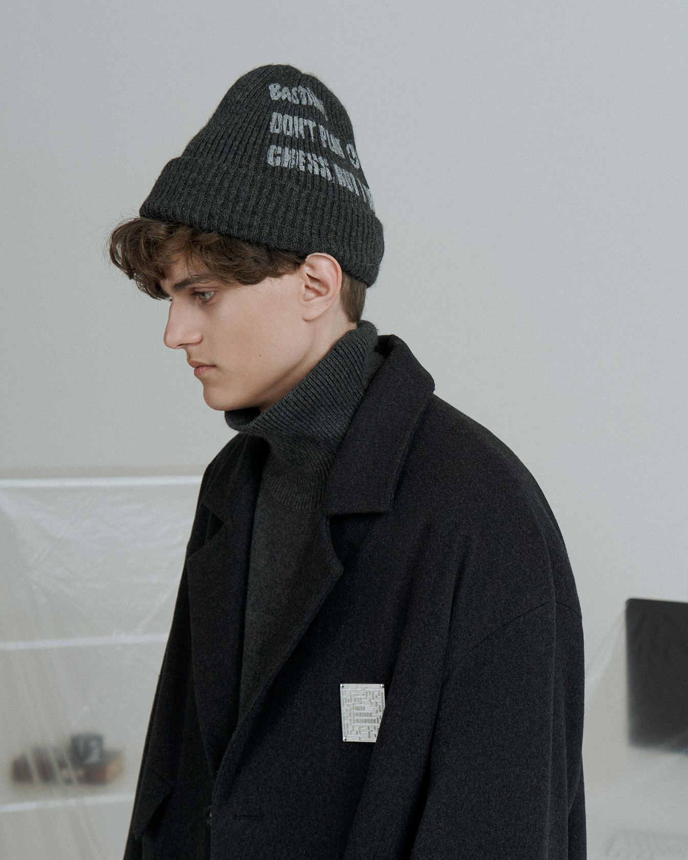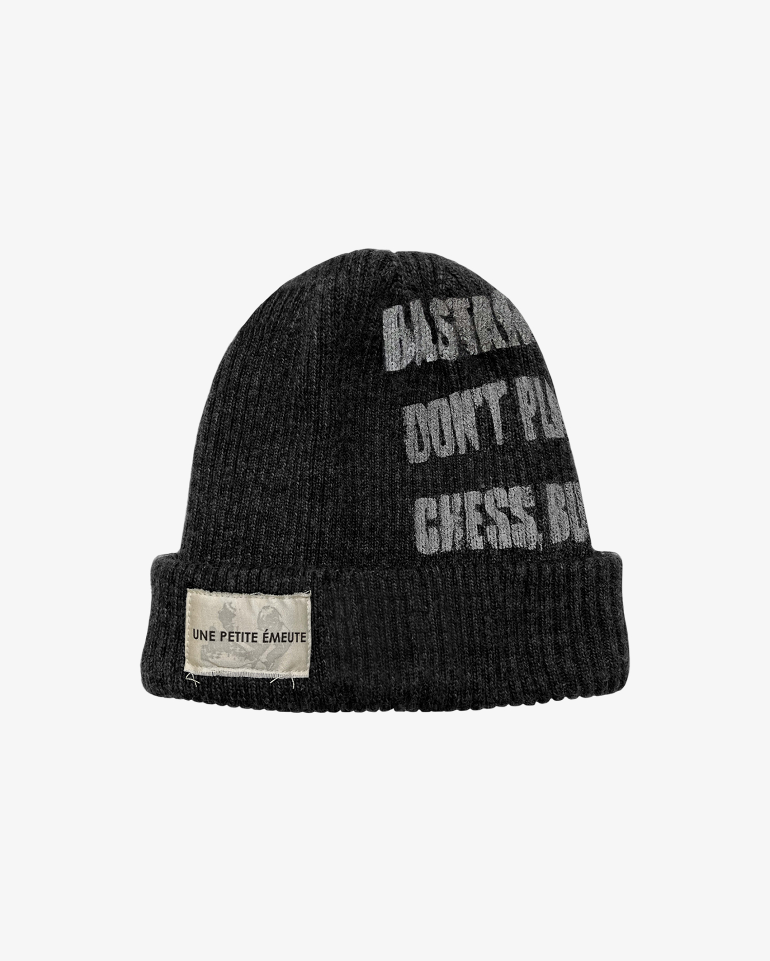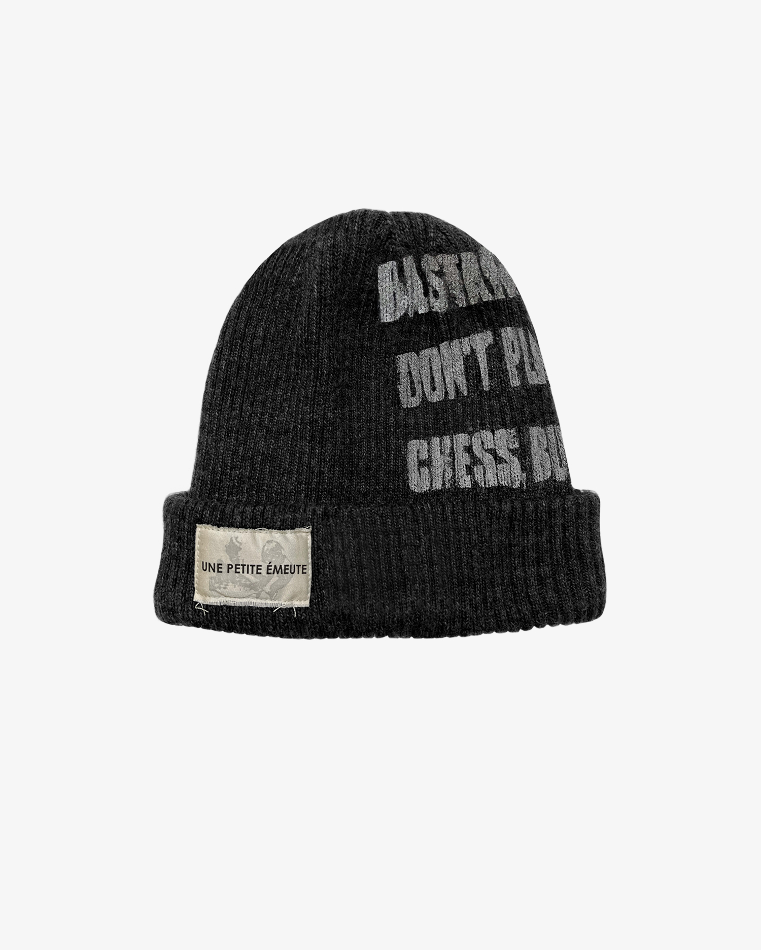 Двухслойная шерстяная шапка с отворотом темно-серого цвета. Отворот шапки украшен хлопковым патчем с логотипом бренда. На левой стороне методом шелкографии нанесен слоган коллекции «Bastards don't play chess... but I do».