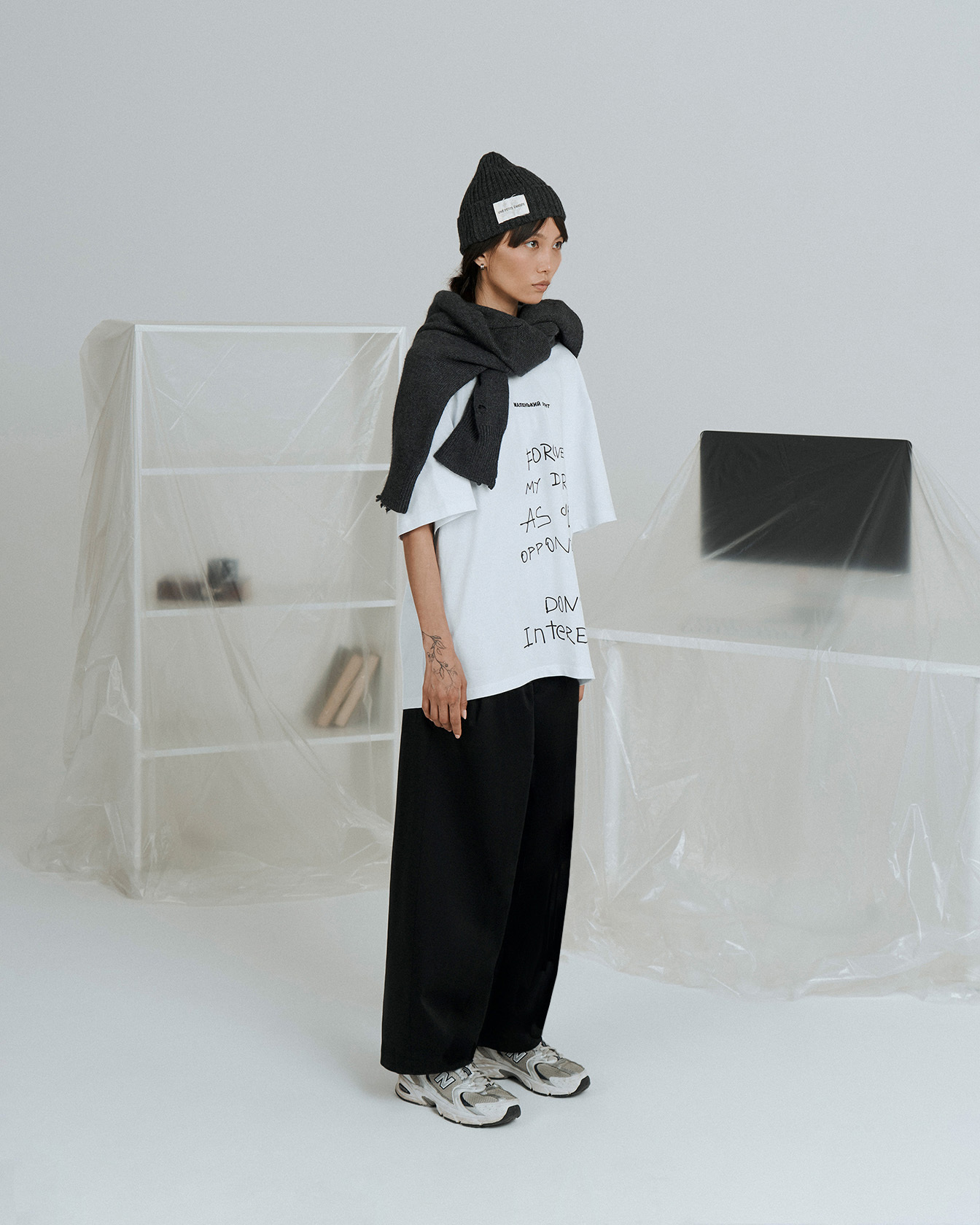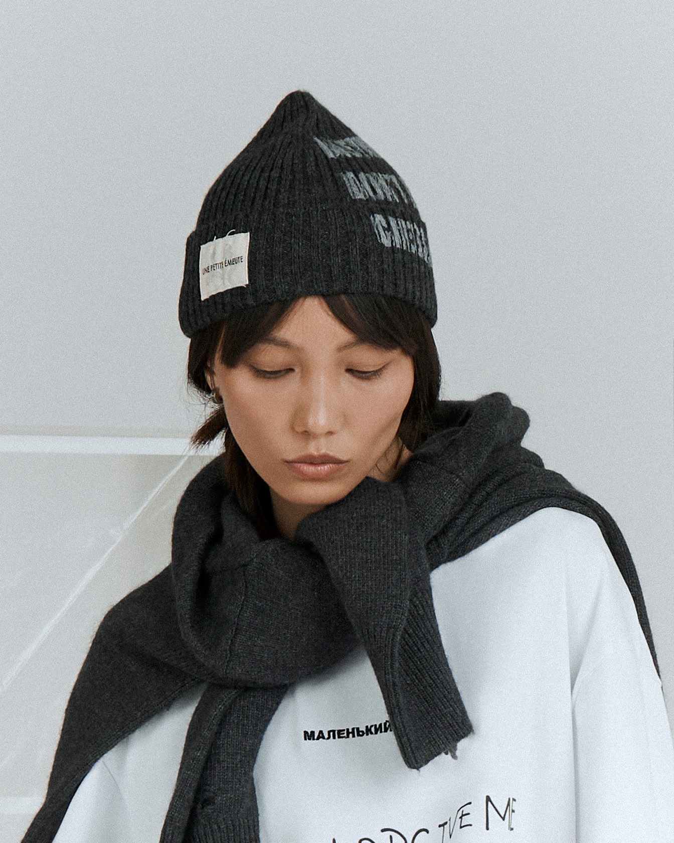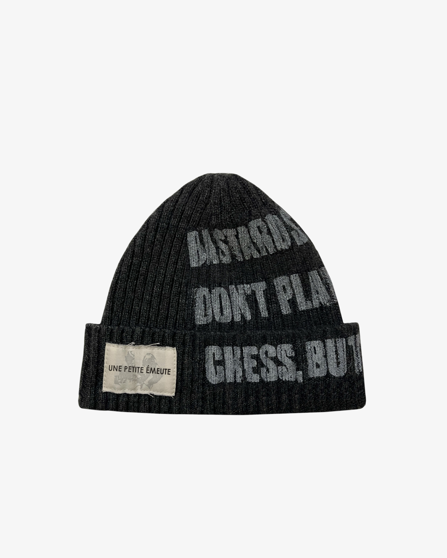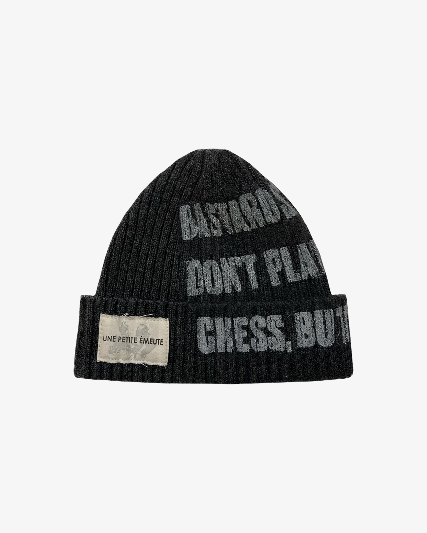 Однослойная шерстяная шапка темно-серого цвета с отворотом. Отворот украшен хлопковым патчем с логотипом бренда. На левой стороне методом шелкографии нанесен слоган коллекции «Bastards don't play chess... but I do».