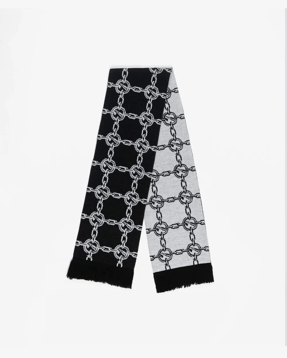 Жаккардовый шарф, выполненный из смесовой шерсти, декорируется узором c принтом «Bottle» и бахромой.