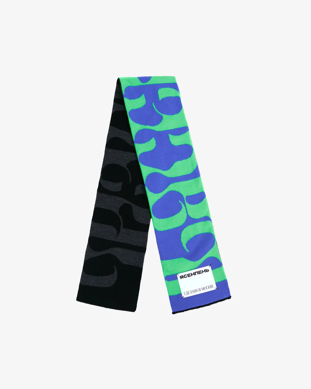 Вязаный двусторонний шарф, с гигантским футуристичным логотипом и крупной белой биркой с обеих сторон. С одной стороны фиолетово-зеленый, с другой чёрно-серый.