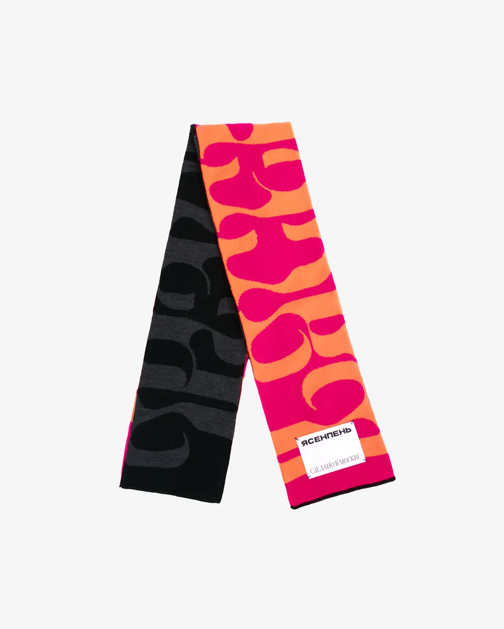 Вязаный двусторонний шарф, с гигантским футуристичным логотипом и крупной белой биркой с обеих сторон. С одной стороны розово-оранжевый, с другой чёрно-серый.