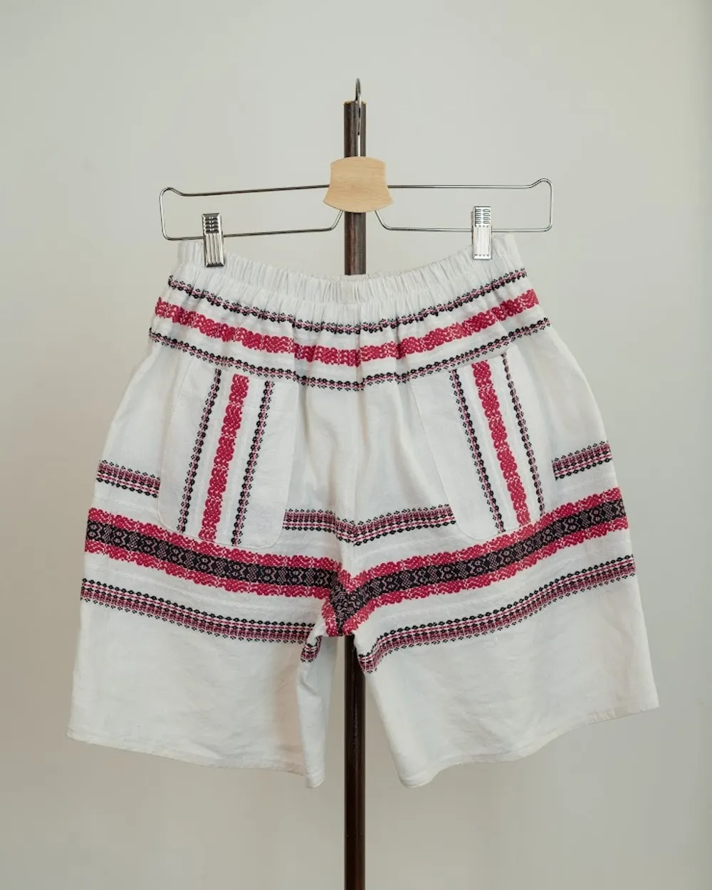Шорты сшиты в одном экземпляре из антикварной плотной хлопковой скатерти (хлопок 100%), периода 1970х годов. Шорты были расшита традиционным узором.