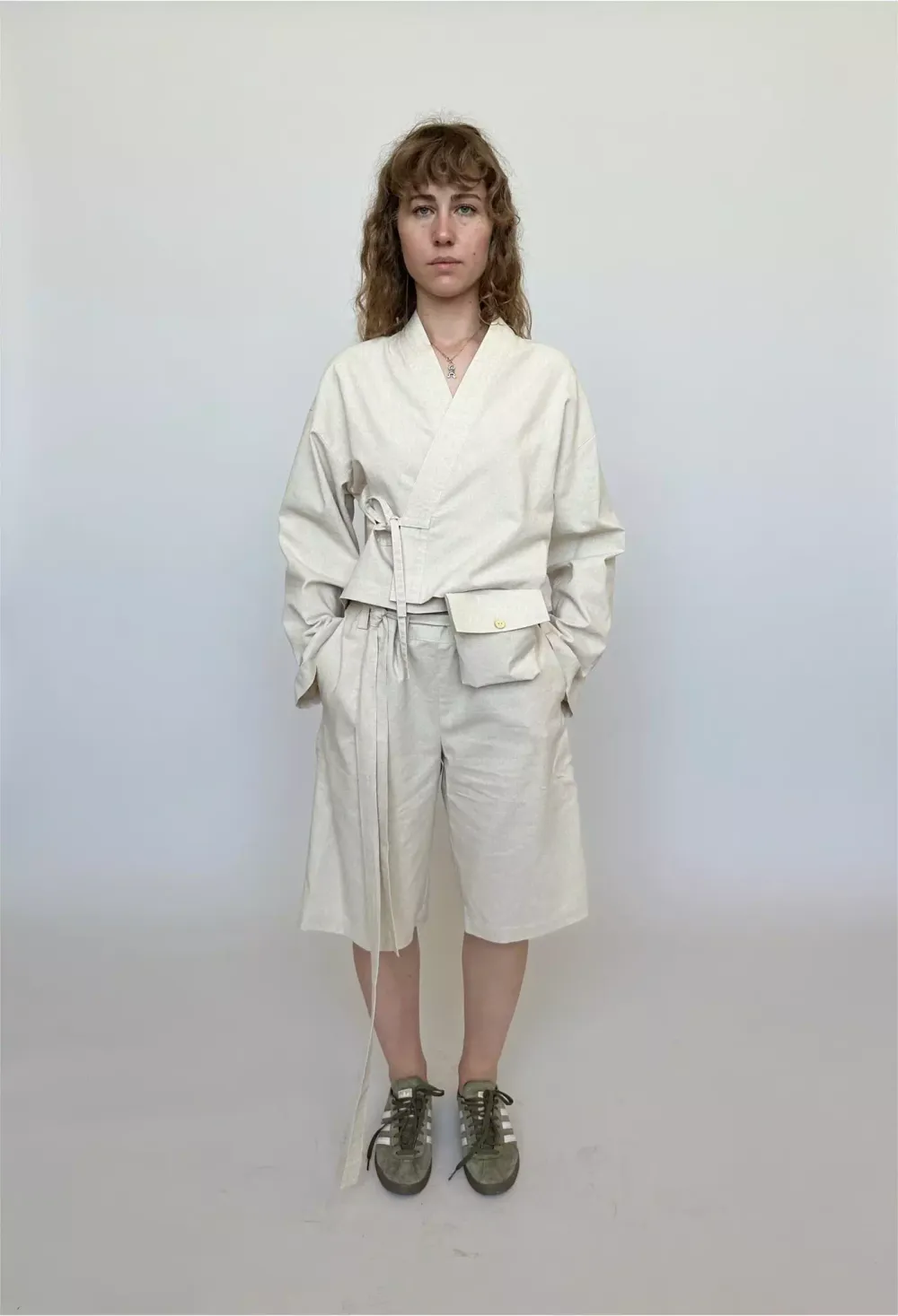Универсальные шорты Хакама для женщин и мужчин с высокой и низкой посадкой талии. Сзади их держит резинка, а впереди широкий, длинный пояс, который позволяет регулировать брюки на разные размеры. По бокам карманы и дополнительный съемный карман-сумка на поясе.