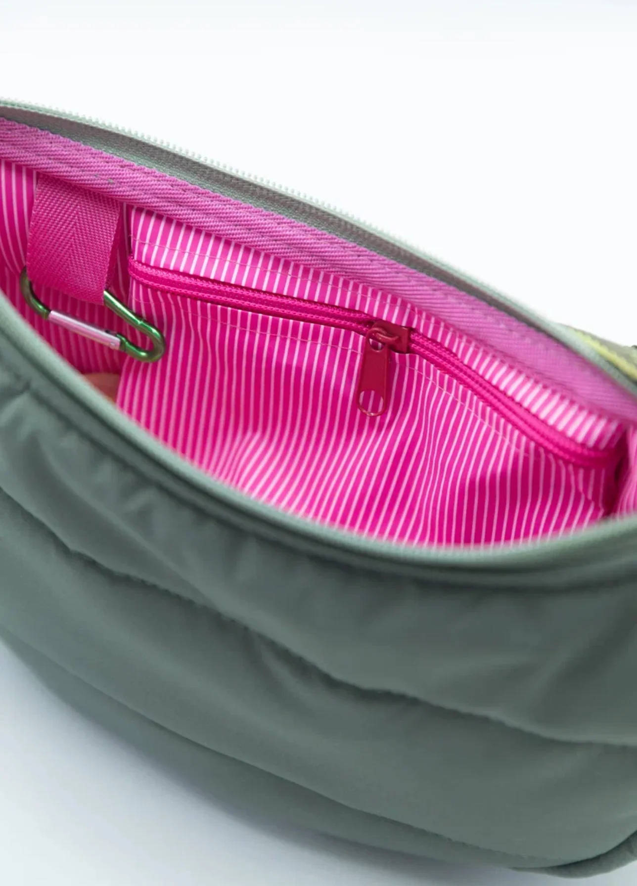 Маленькая сумка в форме дольки, закрывается на тракторную молнию, с регулируемой контрастной стропой. Внутри есть отделение на молнии.