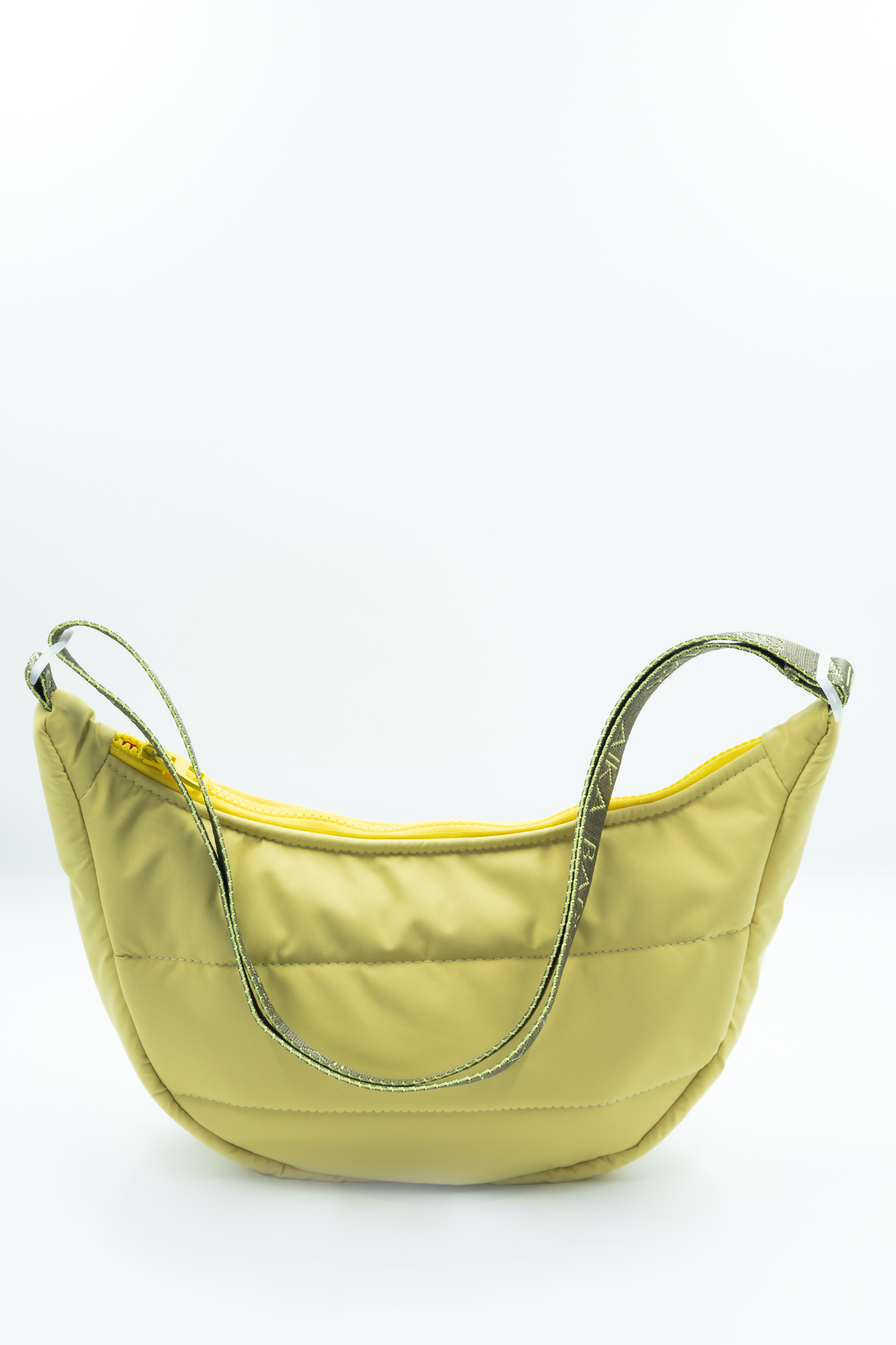 Маленькая сумка в форме дольки, закрывается на тракторную молнию, с регулируемой контрастной стропой. Внутри есть отделение на молнии.