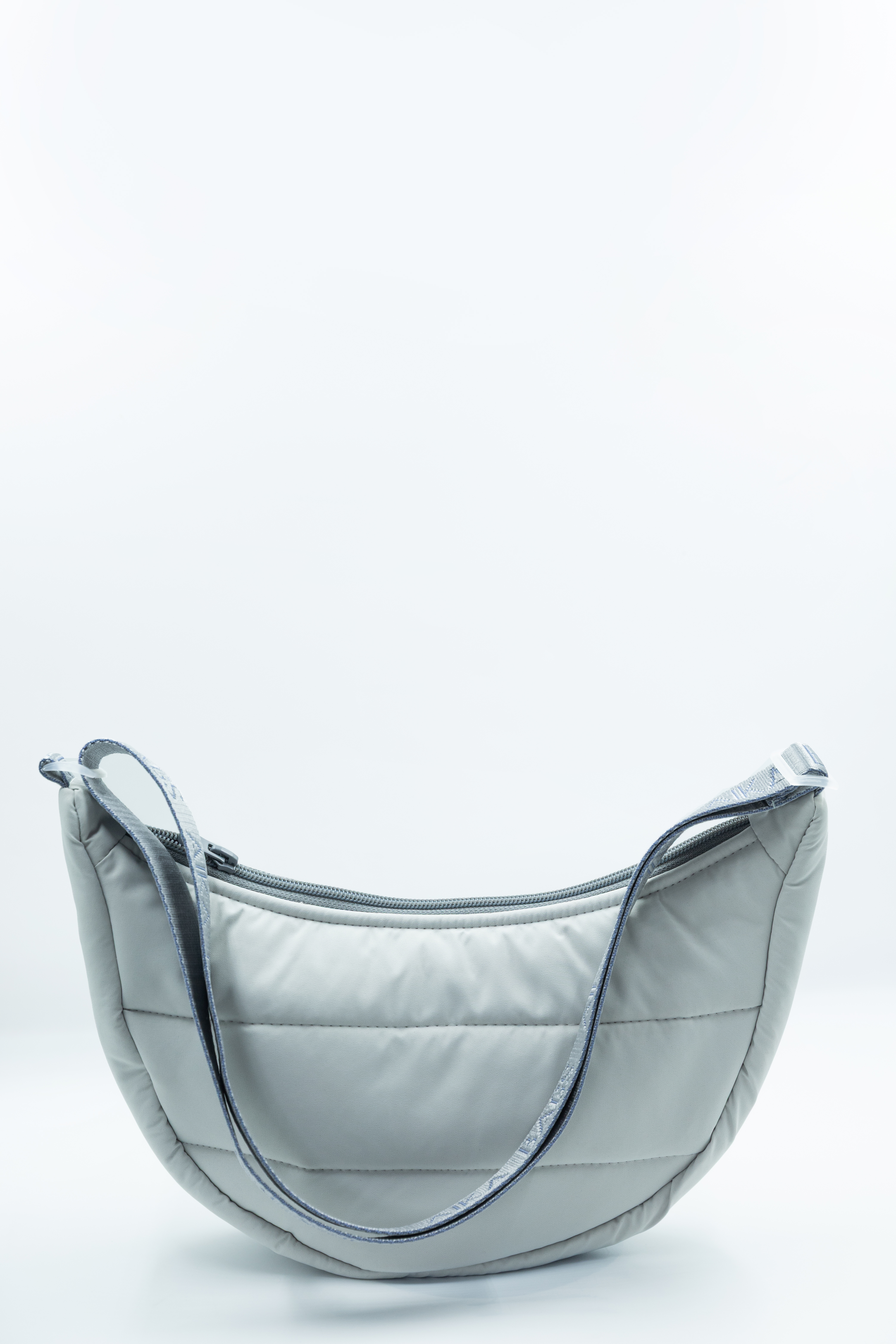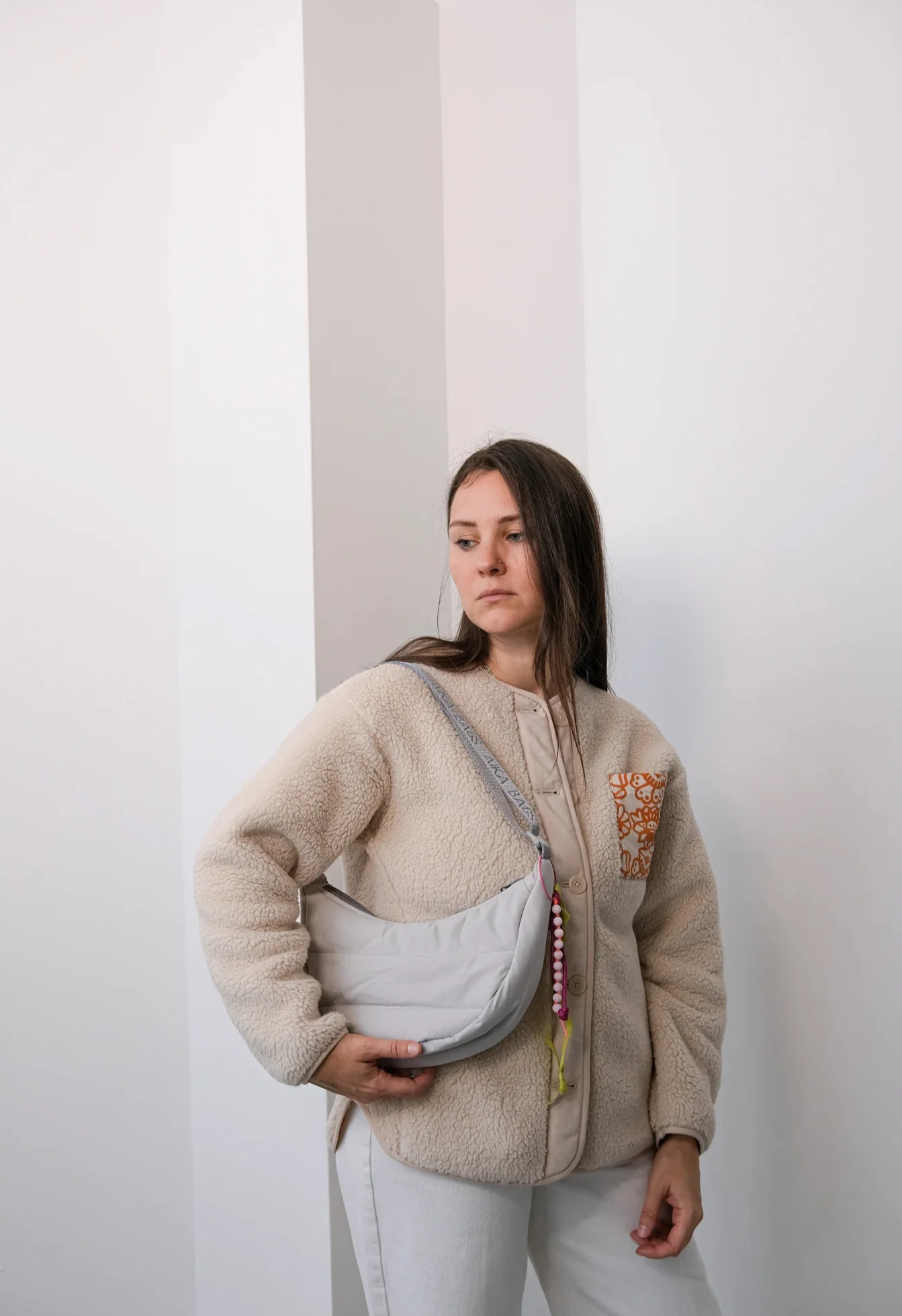 Маленькая сумка в форме дольки, закрывается на тракторную молнию, с регулируемой контрастной стропой. Внутри есть отделение на молнии.