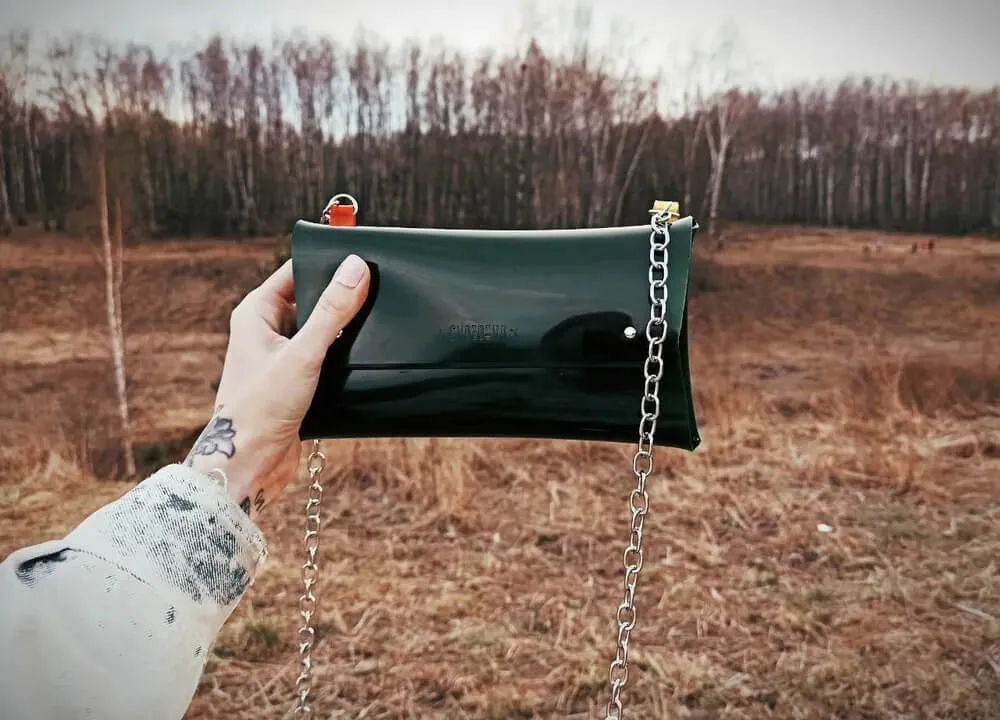 Сумка-конверт на цепочке через плечо из плотного темно зелёного винилового материала, устойчив к трению и любым погодным условиям.