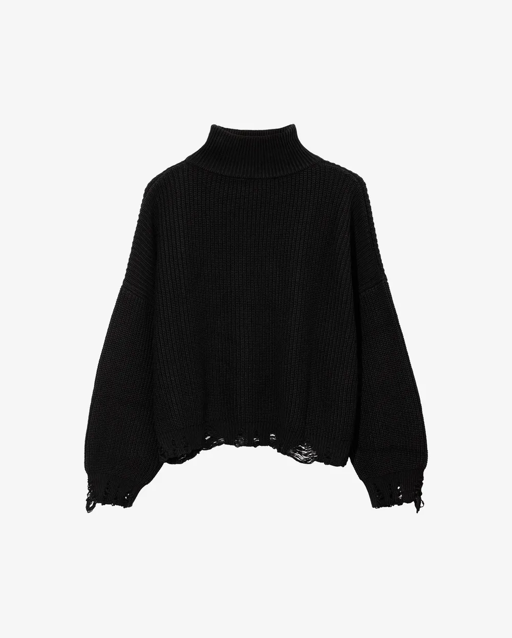 Высокая плотная горловина и укороченный низ с эффектом драни по манжетам.