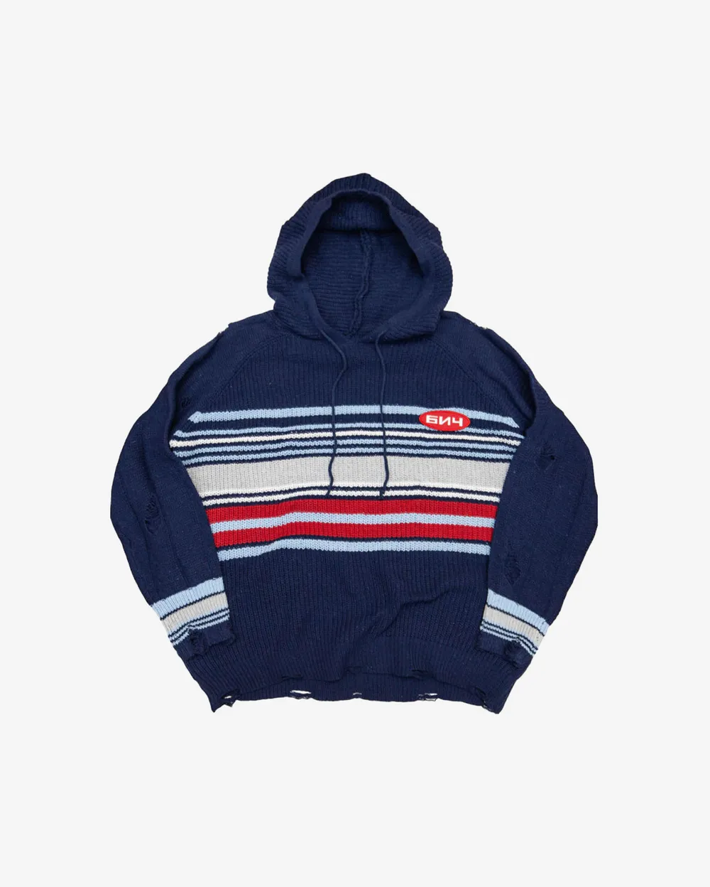 Джемпер-худи, который будто помнит все твои лучшие зимы. Мягкий, уютный и с рваными деталями, которые добавляют характера. Полоски на синем фоне напоминают о детстве: где-то про лыжи, где-то про старую добрую кухню. Это не просто вещь, а настроение, которое носишь