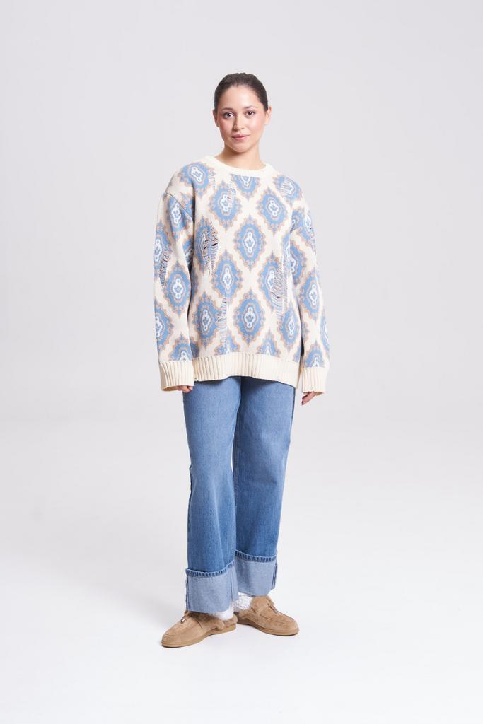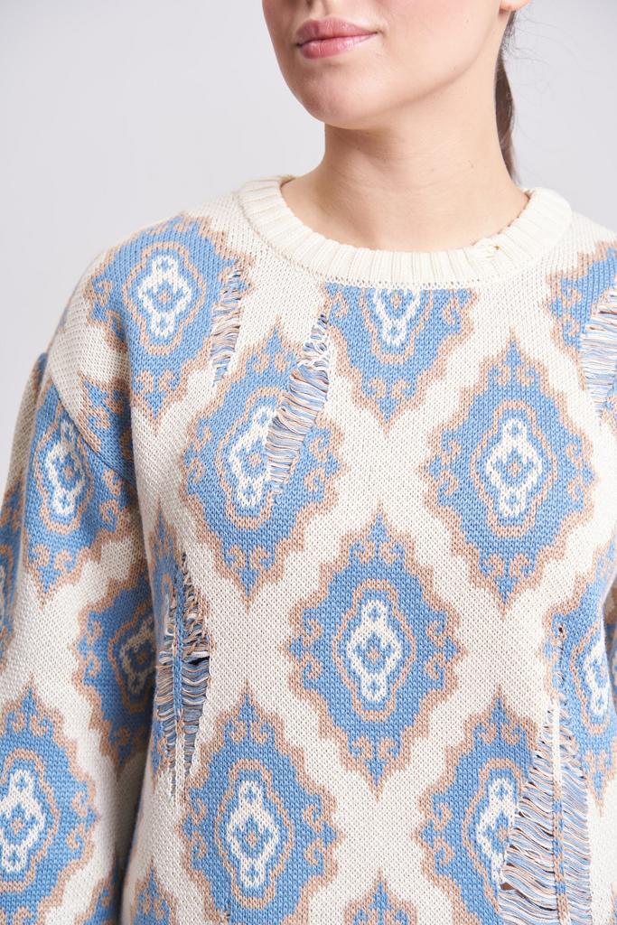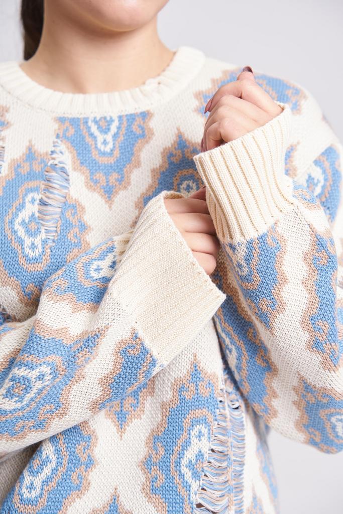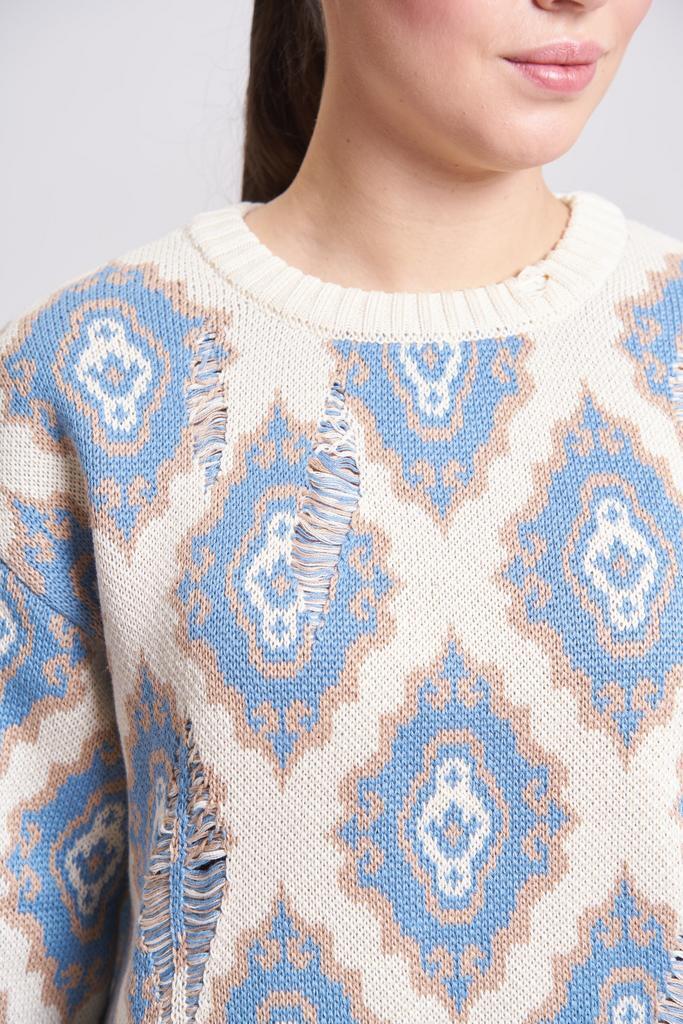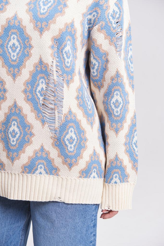Роскошный жаккардовый узор удивительным образом сочетается с трендовыми разрывами в нашем джемпере История.