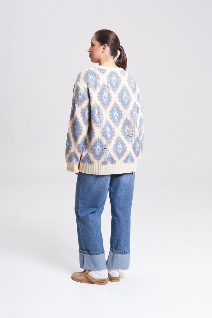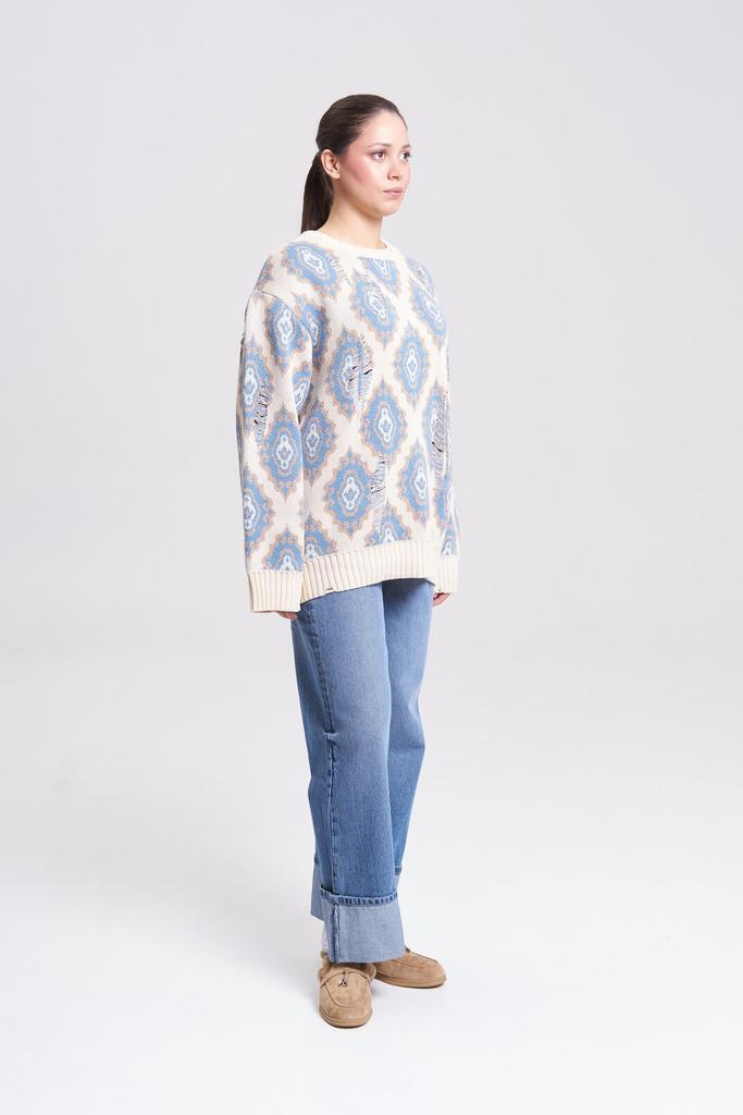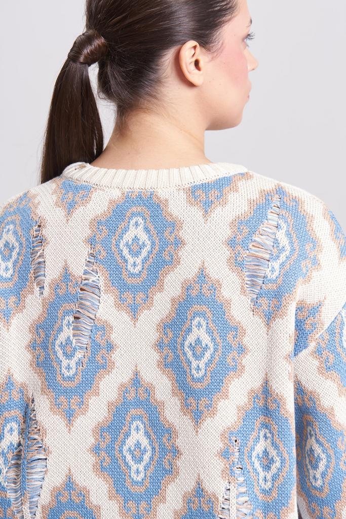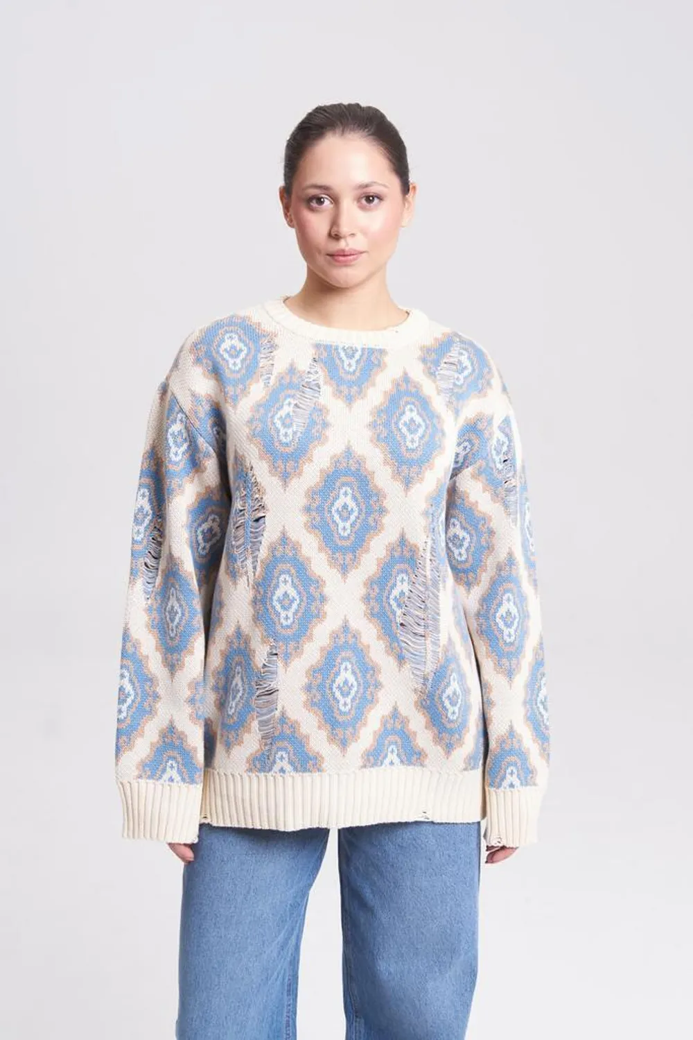 Роскошный жаккардовый узор удивительным образом сочетается с трендовыми разрывами в нашем джемпере История.
