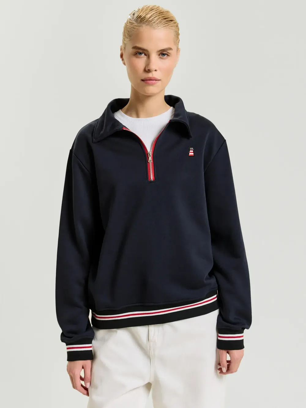 Джемпер из уютнейшего плотного трикотажа с акцентными деталями — молния, резинка и всеми любимый маячок.