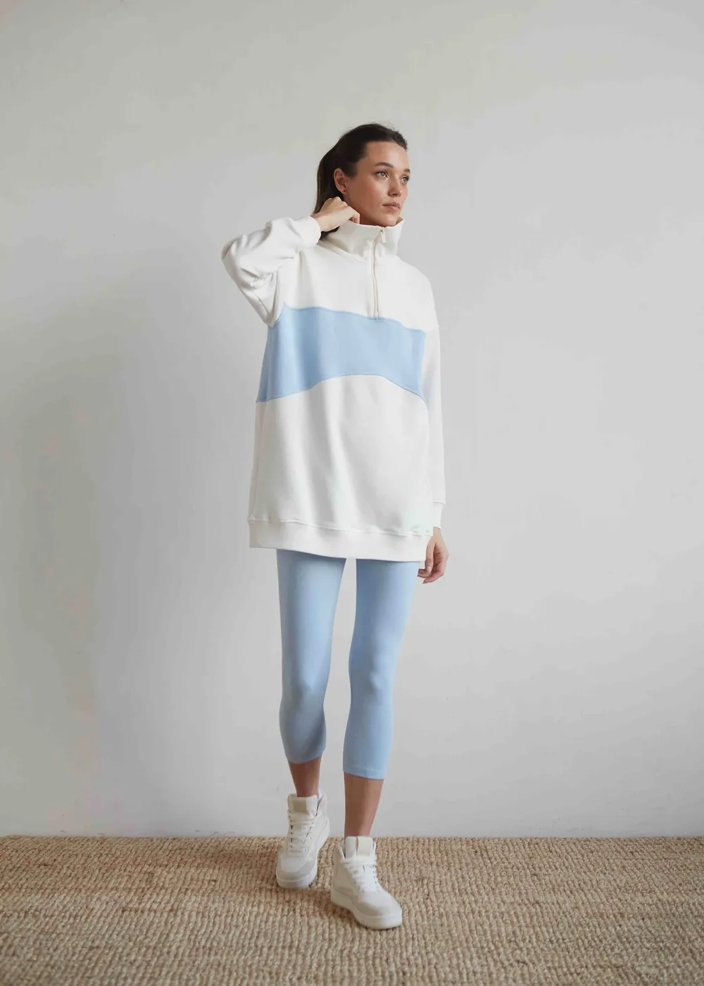Объёмный, удлиненный свитшот с высоким воротником и с застёжкой на тесьму- молнию. Воротник, манжеты рукавов и планка по низу, выполнены из кашкорсе. На груди и на спинке вставка из контрастной ткани.Состав: 88%cotton, 12%polyester