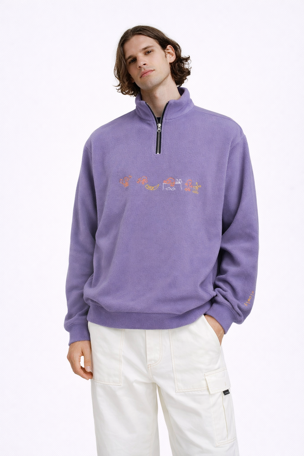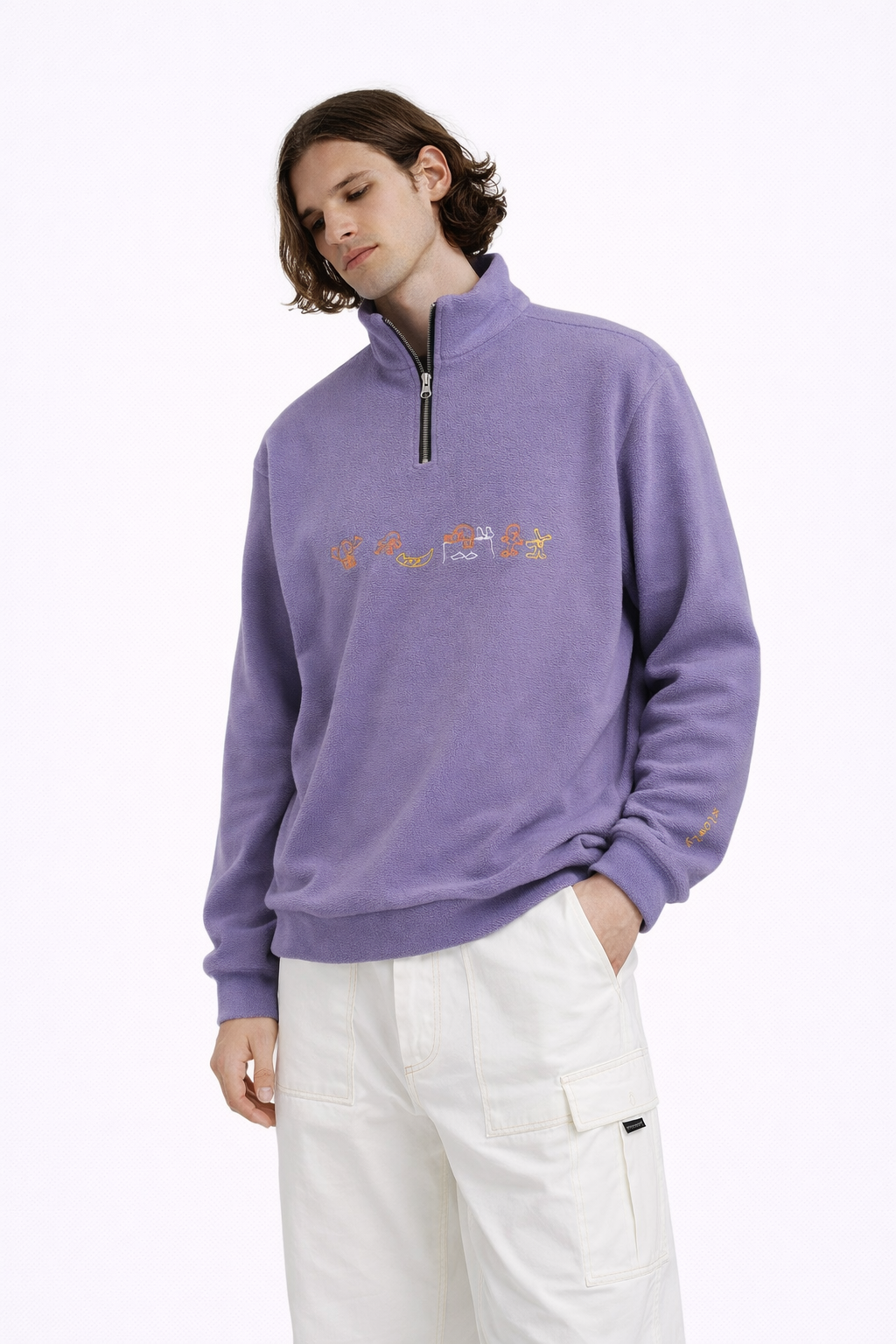 Толстовка прямого силуэта, свободного объема, со спущенным длинным рукавом. Воротник стойка с застежкой на молнию.