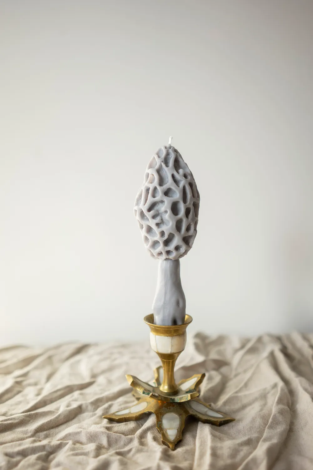 Столовая свеча "Гриб Сморчок" серого цвета с ароматом пачули и дерево, выполнена из пчелиного воска с добавлением французских ароматизаторов.