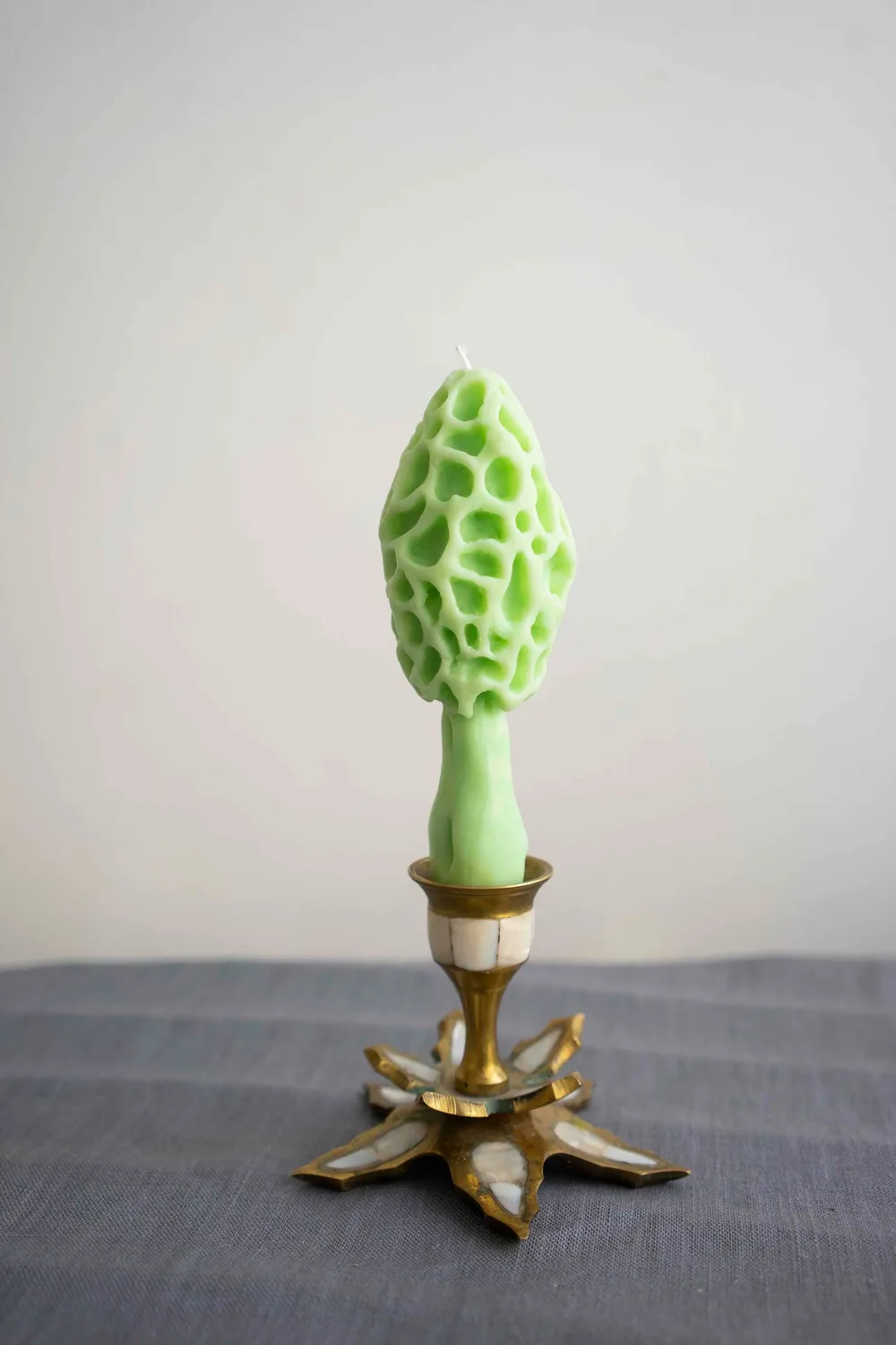 Интерьерная столовая свеча «Сморчок» салатового цвета с ароматом амбры и дерева.