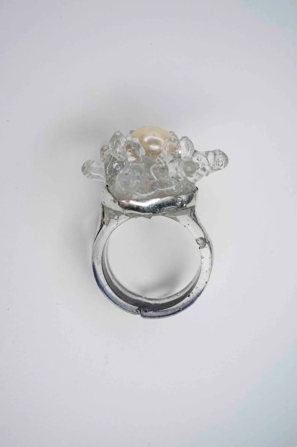 кольцо с прозрачными щупальцами жемчугом и фианитом