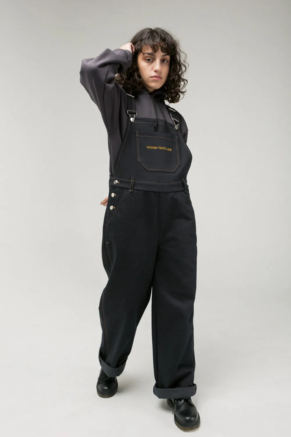 Темно-синий джинсовый комбинезон с контрастной, коричневой отстрочкой. Незаменимый классический стиль на бретелях, регулируемые лямки с металлическими пряжками на пуговицах. Спереди предусмотрен вместительный накладной карман с вышивкой логотипа бренда, а так же два боковых, и два накладных кармана сзади.